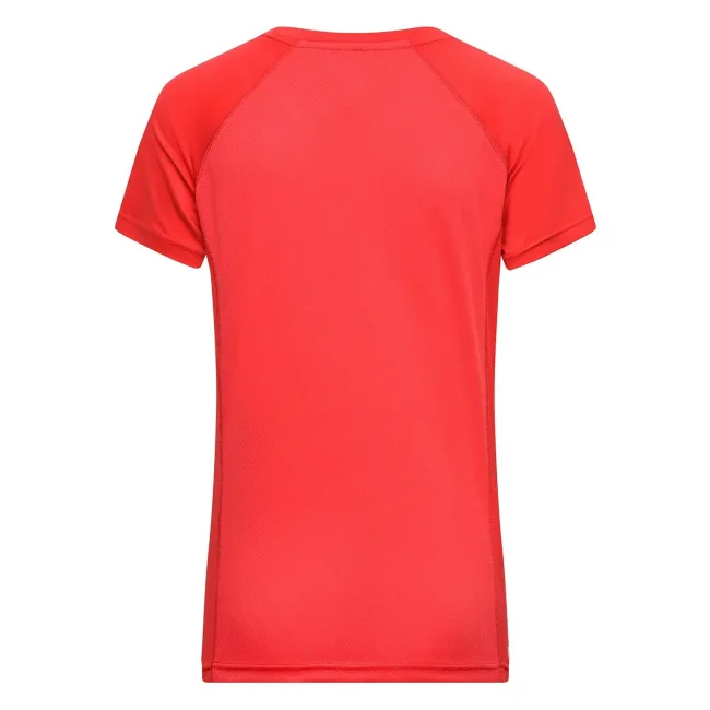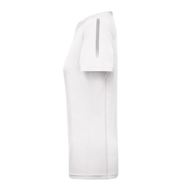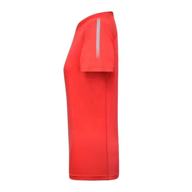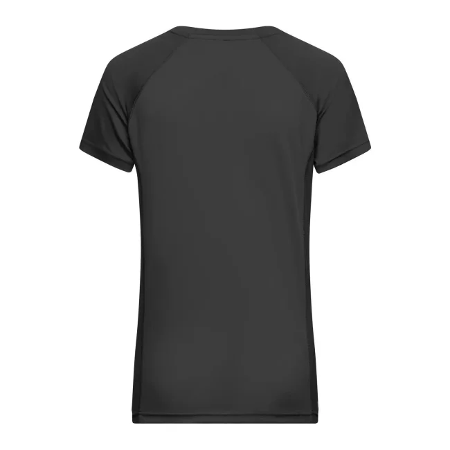 92% poliestere riciclato 8% elastan (tessuto esterno 1), 100% poliestere riciclato (tessuto esterno 2). T-shirt sportiva alla moda, traspirante e con regolazione umidità, asciugatura rapida, leggera e confortevole, maniche raglan, collo rotondo, retro leggermente lavorato, stampa a contrasto sulle spalle, leggermente sfiancata.