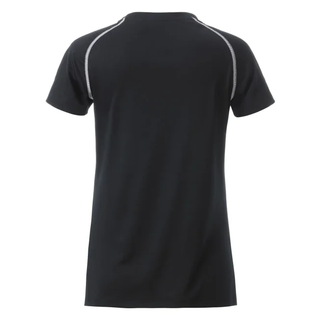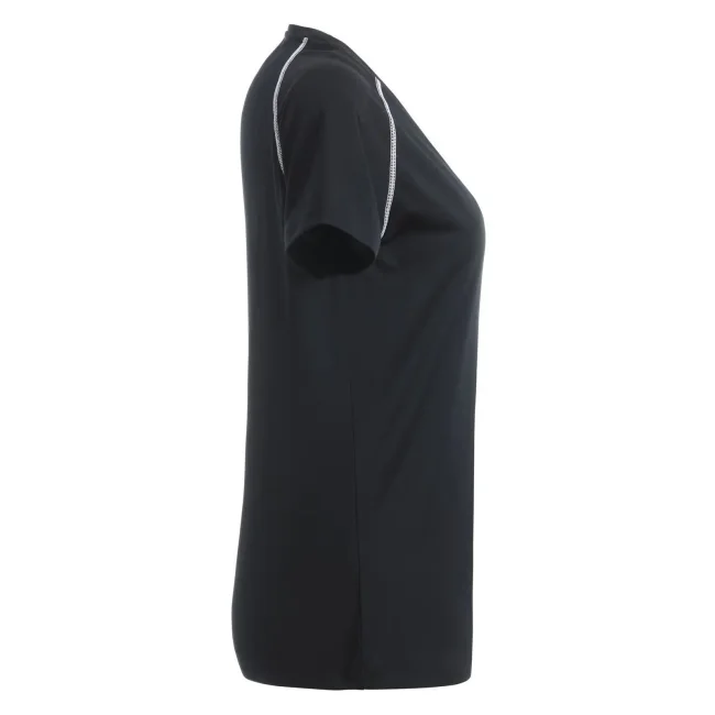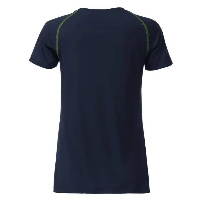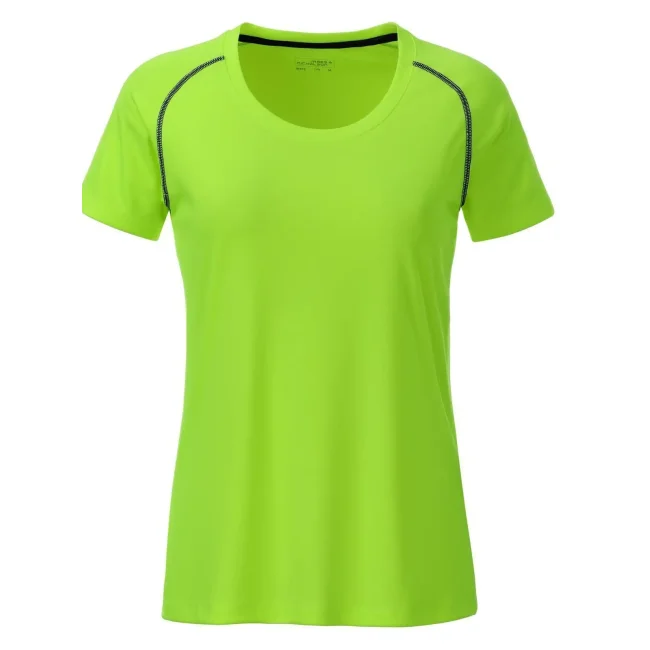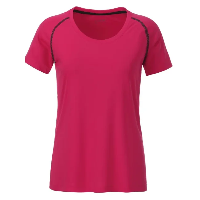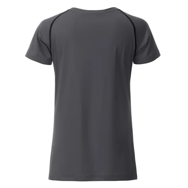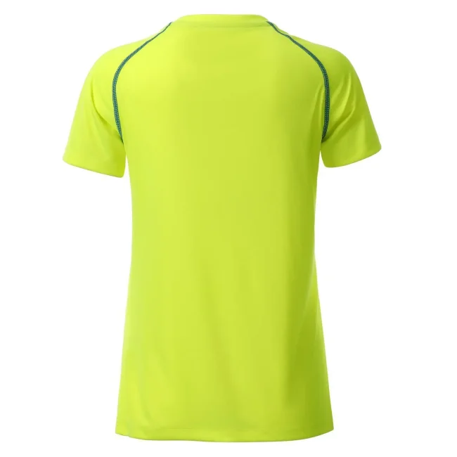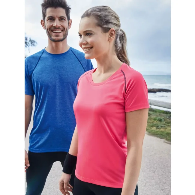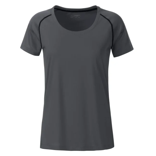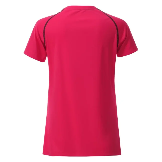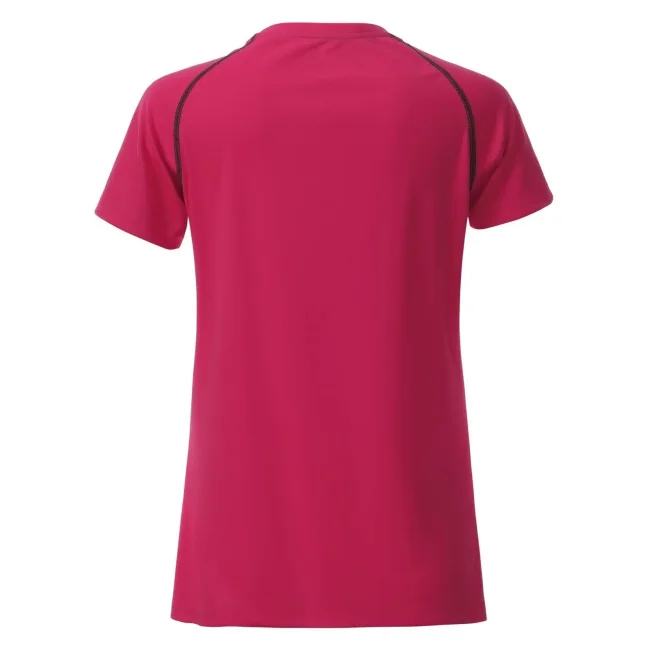 100% poliestere. T shirt donna per fitness e sport Transpirante e con regolazione umidità, Asciugatura rapida, leggera e confortevole, Maniche raglan, collo rotondo, Contrasto cuciture piatte sul davanti e sul retro, leggermente avvitata Tessuto esterno (130 g/m²).