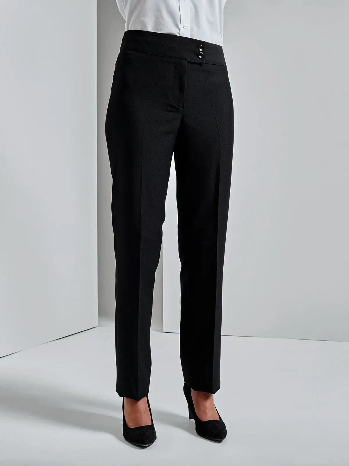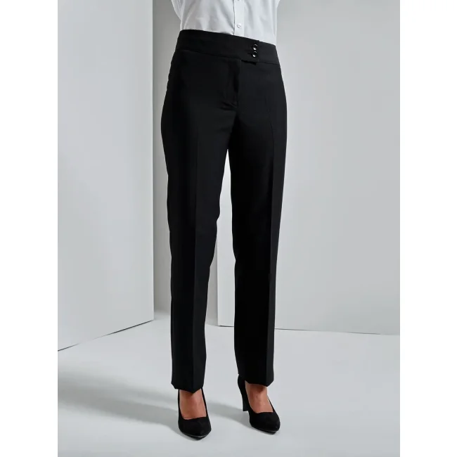 100% poliestere. Pantaloni lunghi da donna, vita alta con 2 bottoni, lavabili a 40°C.