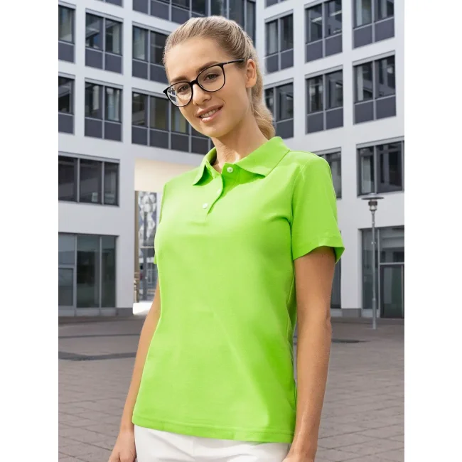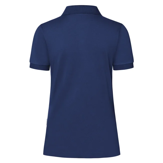 51% poliestere riciclato, 47% cotone, 2% elastan, 220 g/m², jersey-piqué. Polo da donna in materiale resistente e sostenibile, easy-care. Leggermente sfiancata, colletto in maglia con banda di rinforzo, bordi manica in maglia, cuciture doppie, pattina a 3 bottoni a contrasto, spacchetti laterali. Prodotto certificato GRS, Green Button e Oeko-Tex.