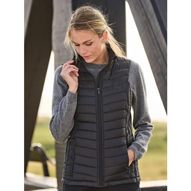 100% poliestere (300T), imbottitura e fodera: 100% poliestere. Giacca donna smanicata con zip, antivento, idrorepellente, tasca interna per la decorazione, tasche laterali con zip