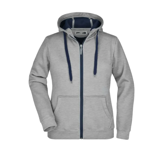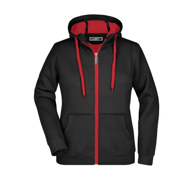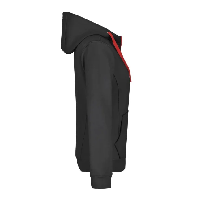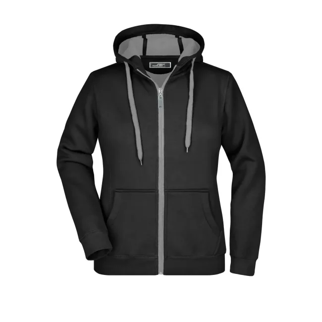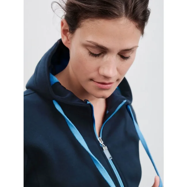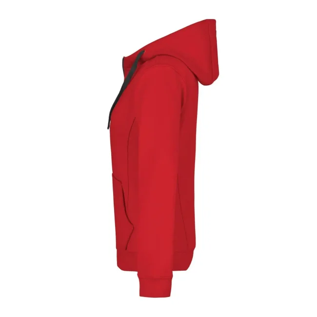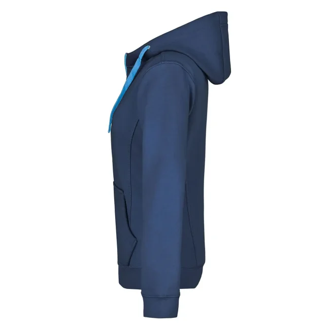 55% poliestere, 45% cotone. Felpa sportiva con maniche set-in. Zip intera, parte interna del cappuccio, parte interna della felpa e cordoncini di colore contrastante, polsini e orlo inferiore con elastane, tasca a marsupio, leggermente sfiancata, struttura con cuciture laterali, felpata internamente.