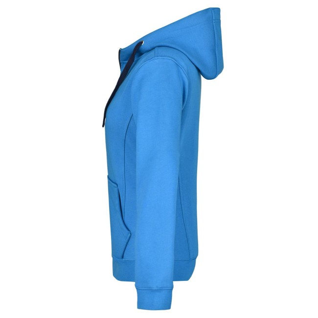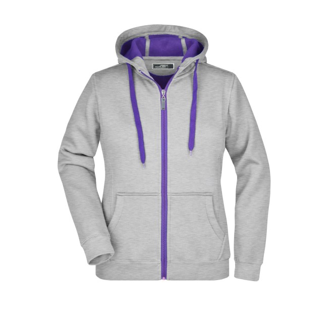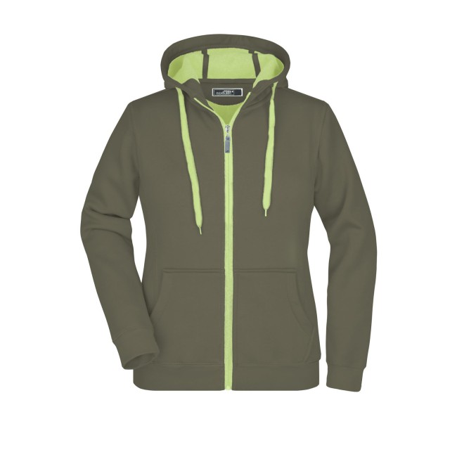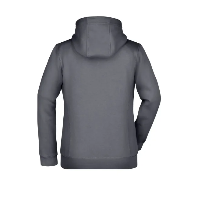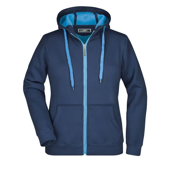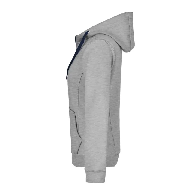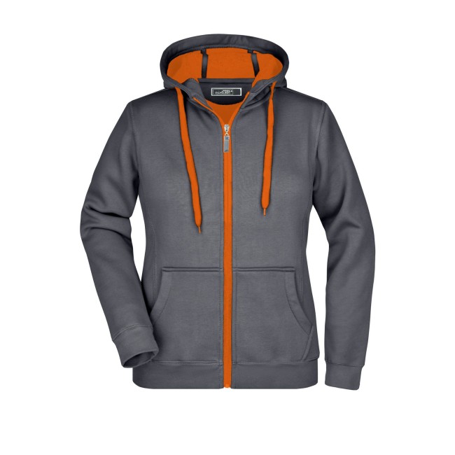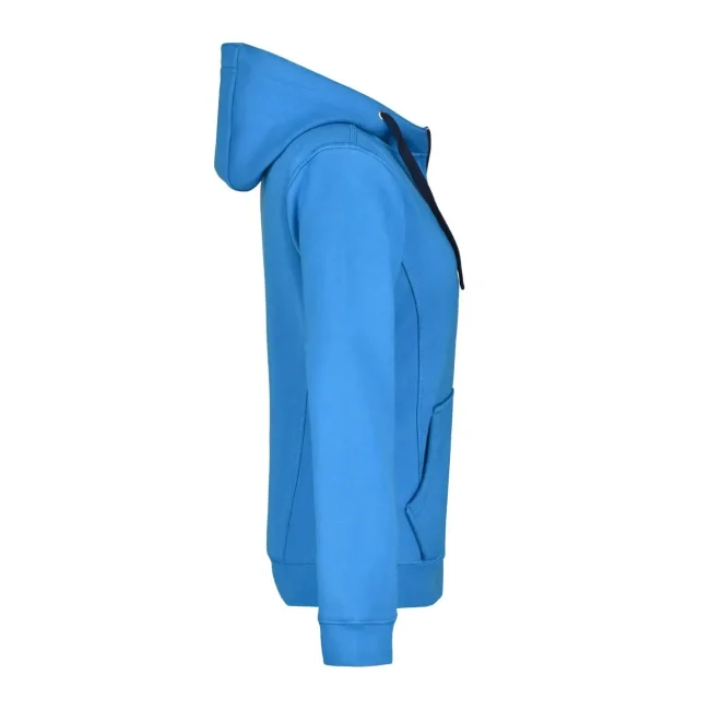 55% poliestere, 45% cotone. Felpa sportiva con maniche set-in. Zip intera, parte interna del cappuccio, parte interna della felpa e cordoncini di colore contrastante, polsini e orlo inferiore con elastane, tasca a marsupio, leggermente sfiancata, struttura con cuciture laterali, felpata internamente.