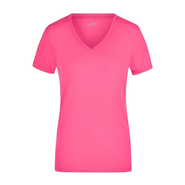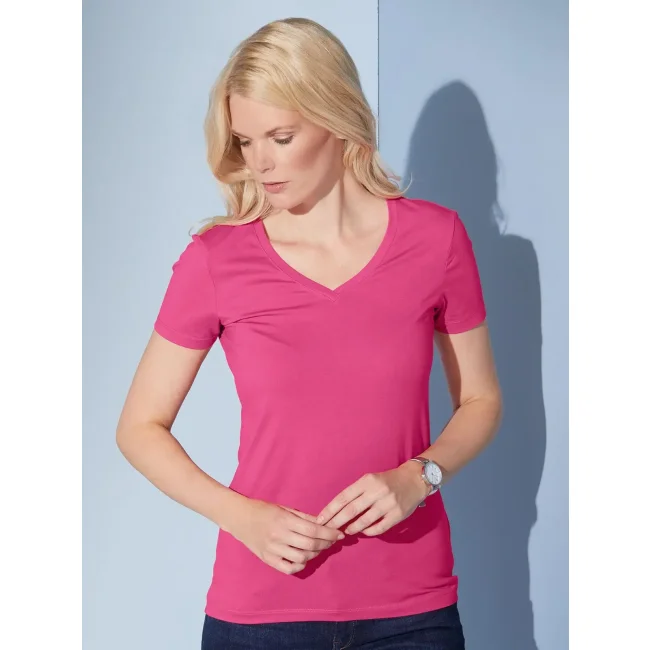 95% cotone, 5% elastan. T-shirt elasticizzato da jersey elastico morbido Taglio ampio, Scollo con bordino stretto Tessuto esterno (170 g/m²). Manica corta, Donna, Taglio sciancrato, Collo a V