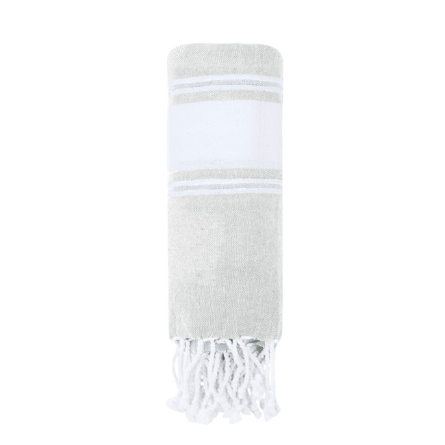 Morbido pareo asciugamano in cotone riciclato al 100% da 180 g/m2. Disponibile in un'ampia gamma di colori in bicolore. Logo sull'etichetta laterale. Presentato singolarmente in una borsa.