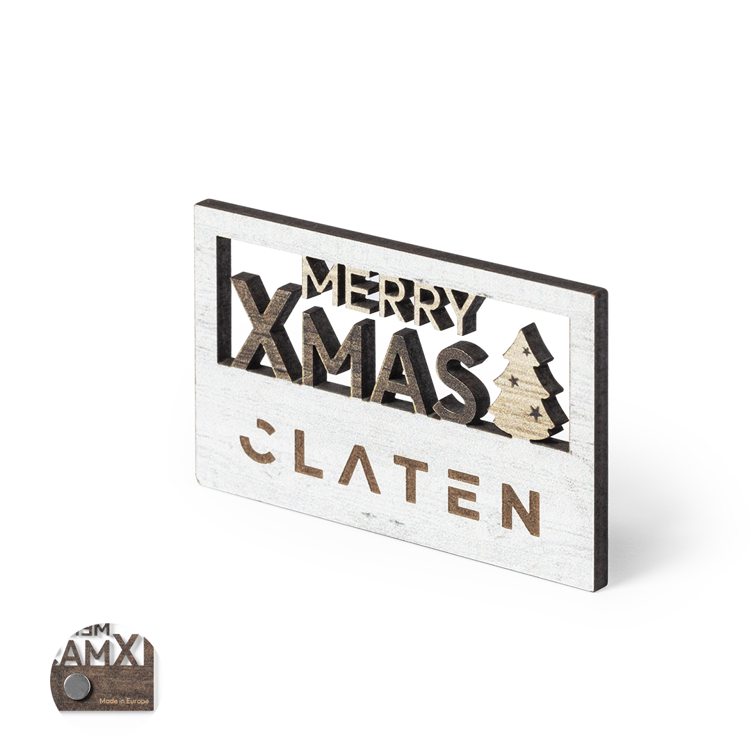 Originale calamita Merry Christmas in legno naturale, con testo fustellato e finitura originale bicolore. Ampia superficie per la stampa e logo Made In Europe.
