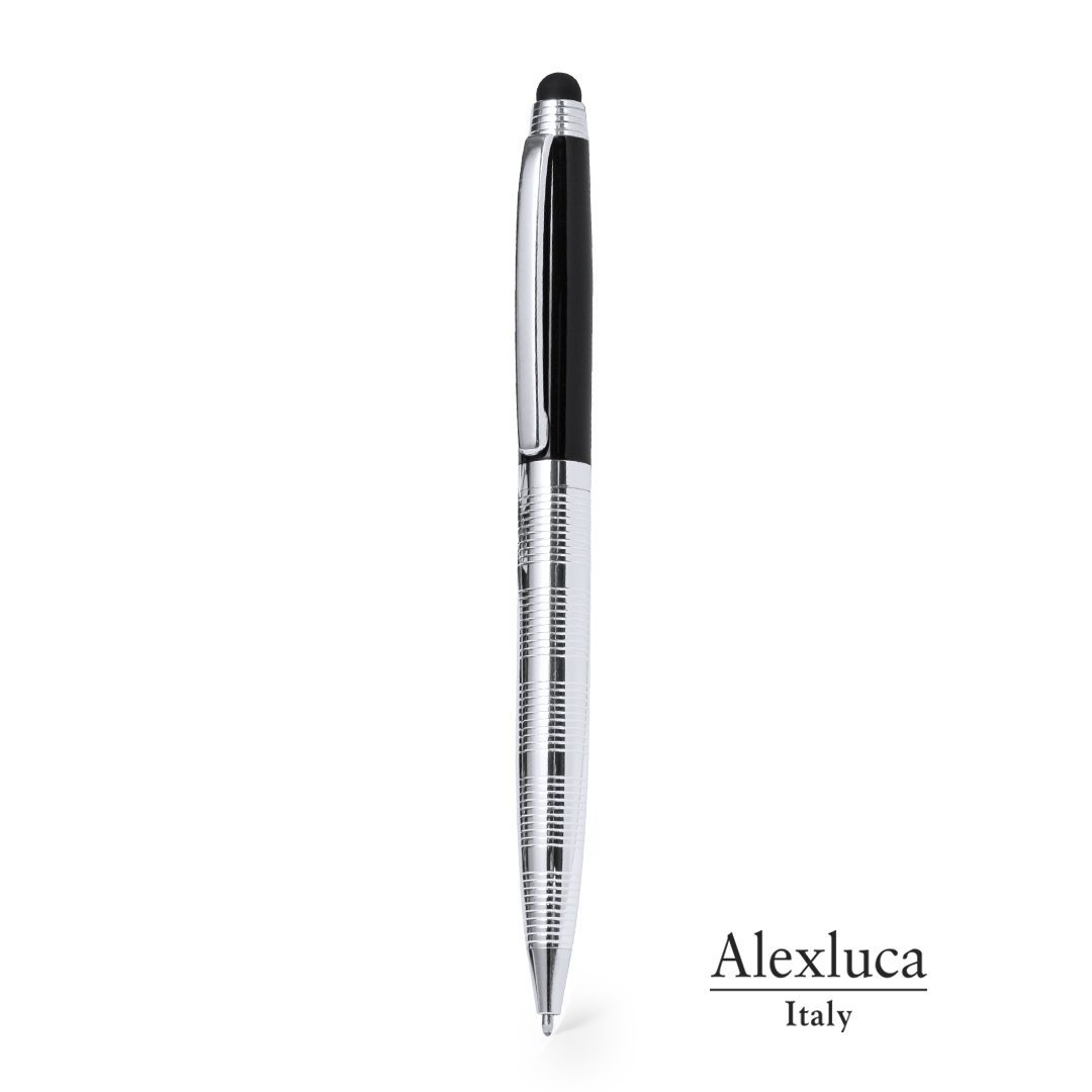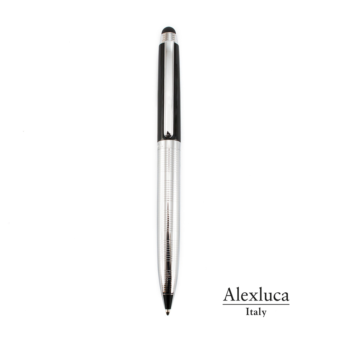 Penna Touch by Alexluca con meccanismo a rotazione e fusto in metallo liscio in un'elegante combinazione di colori argento e nero. Clip e impugnatura dal design coordinato. Presentata in astuccio individuale nero con logo del marchio. Inchiostro blu.