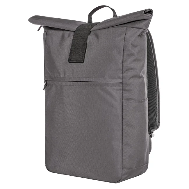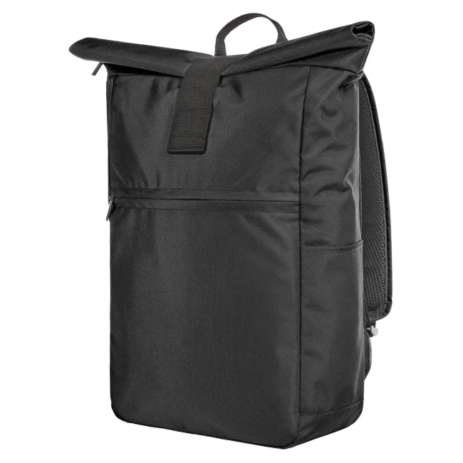 RPET. Materiale esterno RPET. Zaino con risvolto, ampio scomparto principale con chiusura lampo e linguetta con velcro, tasca per notebook imbottita e tasca piatta a inserto interna, ampia tasca anteriore con chiusura lampo, due tasche laterali a inserto, spallacci imbottiti, con manico.