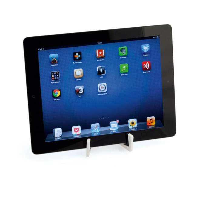 Supporto per dispositivi mobili con gambe pieghevoli e paracolpi in PVC antiscivolo. In colori vivaci e appositamente progettati per la tampografia.