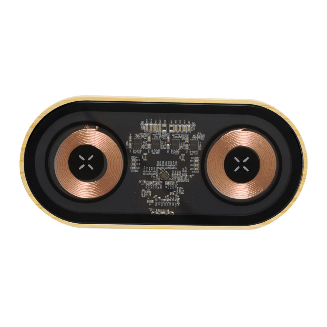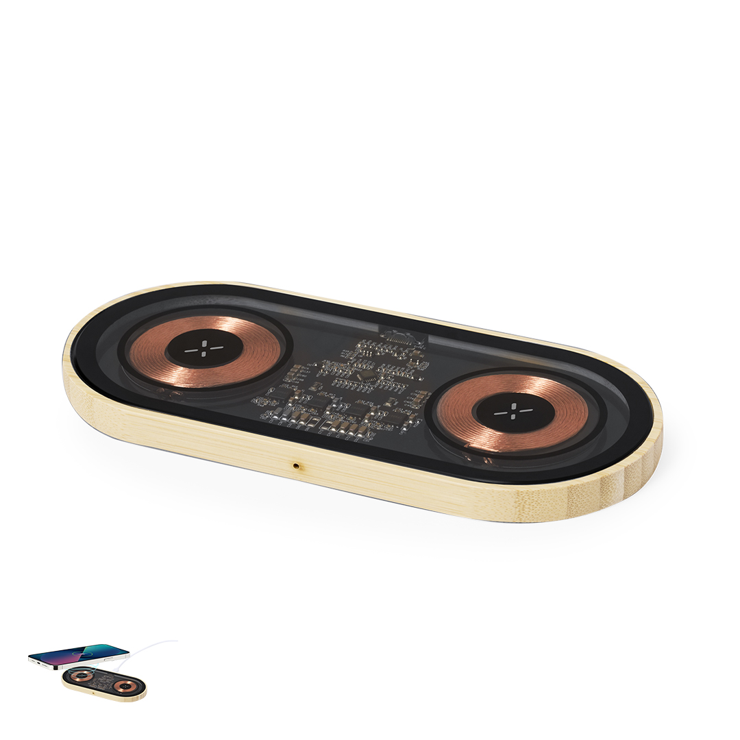 Caricabatterie wireless doppio da 15W con un design originale e una superficie trasparente che permette di vedere i componenti interni del dispositivo. Con base in bambù, compatibile con i dispositivi con tecnologia Qi, e consente anche di caricare due dispositivi contemporaneamente. Connessione di tipo C, con istruzioni per l'uso in inglese e spagnolo. Presentato in una scatola individuale dal design kraft.Materiali come il bambù favoriscono l'utilizzo di materie prime naturali, riducendo le emissioni inquinanti. Proviene da una pianta altamente resistente e versatile, con una rapida crescita e rigenerazione, rappresentando un'ottima alternativa all'uso del legno tradizionale.Prodotto secondo gli standard RoHS e in conformità ai seguenti requisiti di sicurezza:Sistema di protezione dal surriscaldamento.Sistema di protezione dal sovraccarico.Sistema di blocco per evitare cortocircuiti.