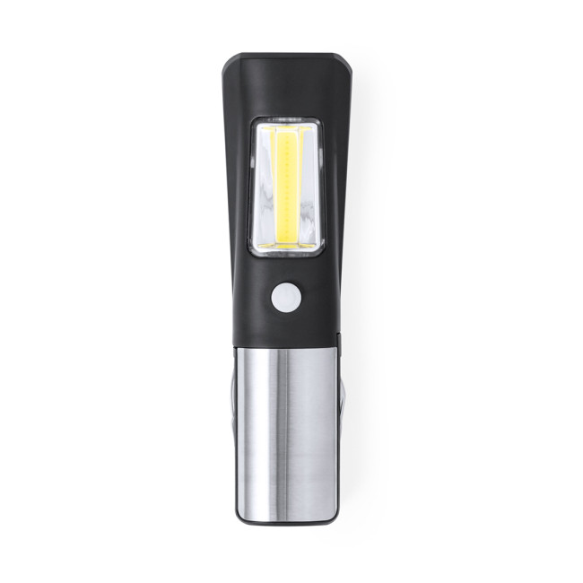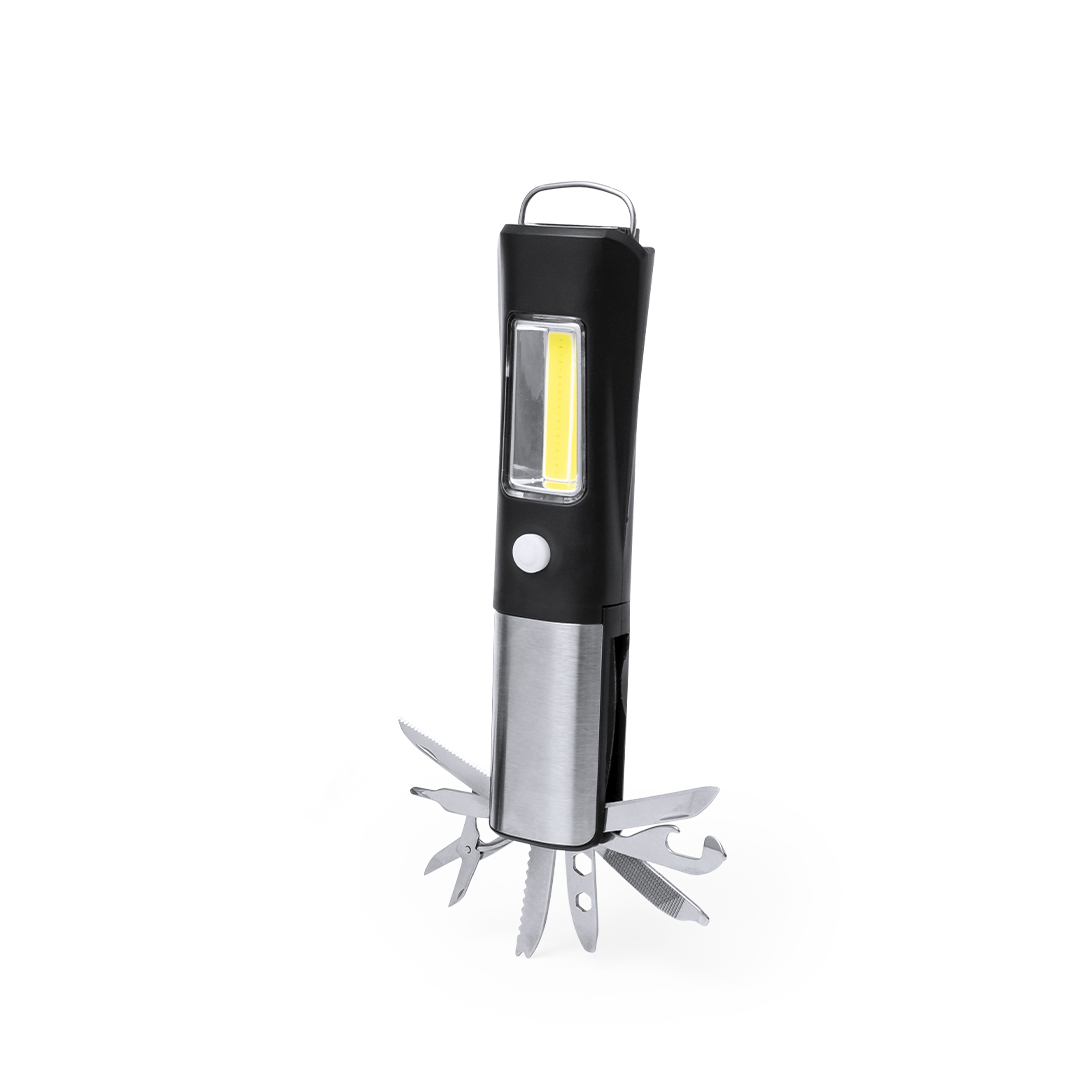 Pratico multiutensile in robusto ABS e acciaio inox, con torcia integrata a 1 LED. Include torcia laterale a19 led COB a due posizioni di illuminazione (fissa e lampeggiante). Dispone di 13 funzioni, tra cui coltello liscio, coltello seghettato, cacciavite a croce, forbici, cacciavite piatto, chiave esagonale di varie dimensioni, apriscatole, apribottiglie e lima. Con magnete e impugnatura. Alimentato da 3 batterie AAA, non incluse. Presentato in una scatola kraft di design.