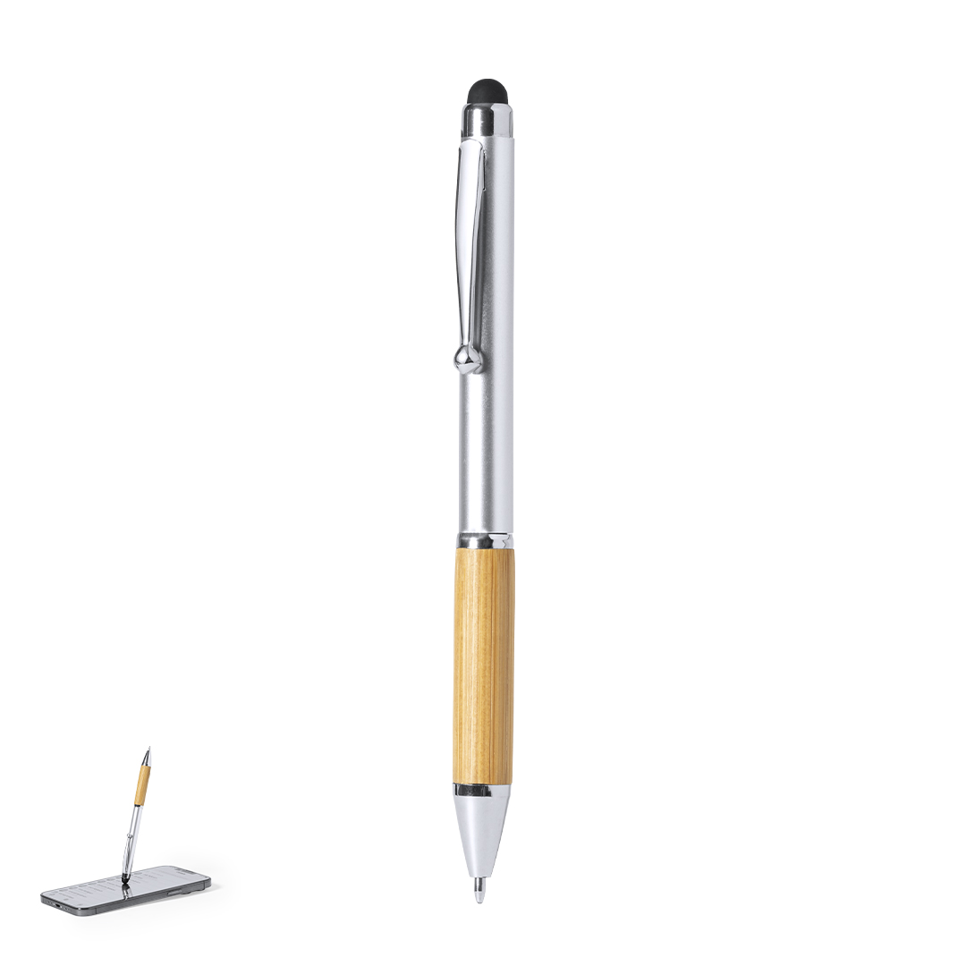 Elegante penna a sfera stilo della linea natura con meccanismo a rotazione. Corpo in ABS con finitura lucida e impugnatura in bambù, con accessori coordinati. Clip metallica e inchiostro blu.