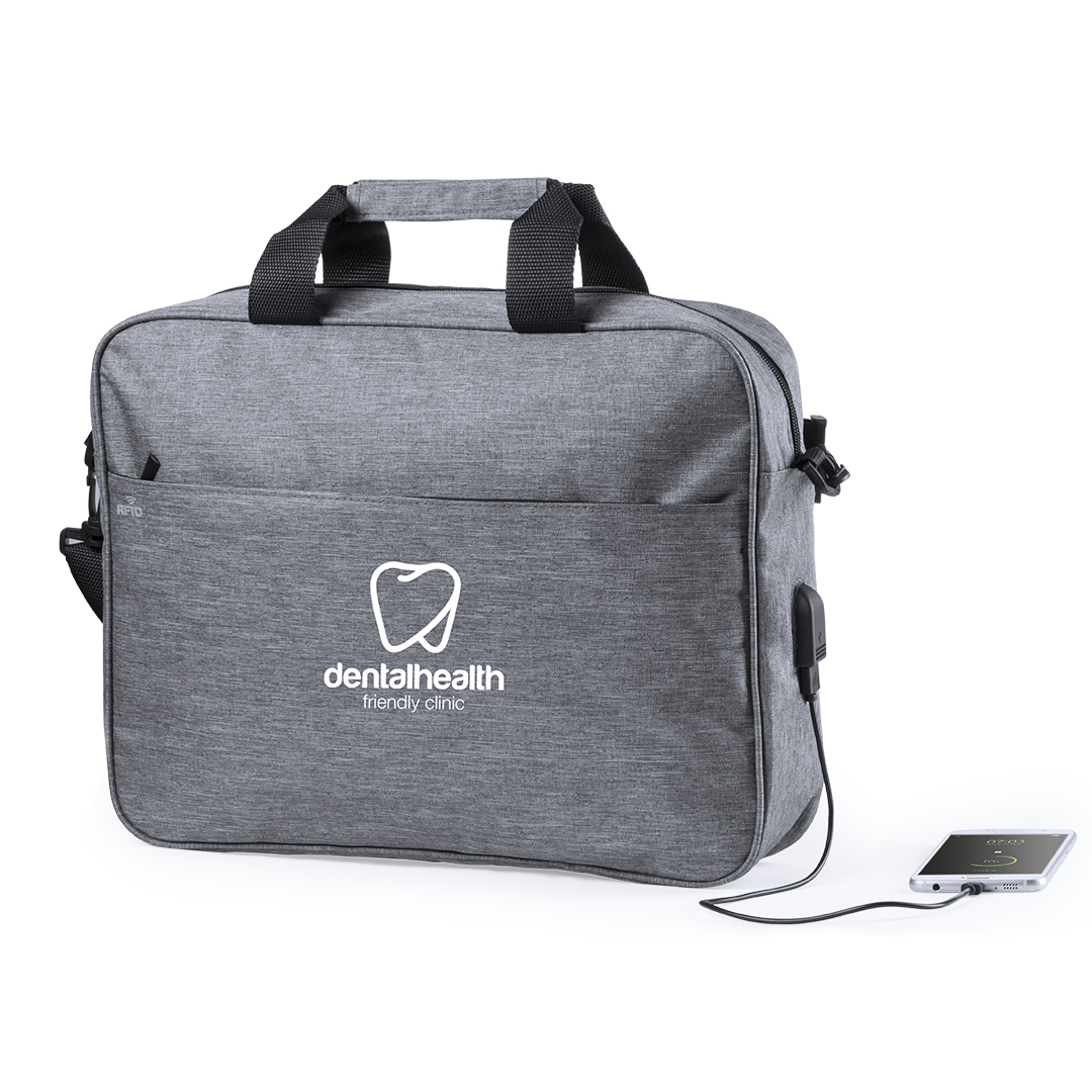 Portadocumenti di sicurezza dal design urbano in resistente poliestere 300D. Tasca interna con protezione di sicurezza RFID (Radio Frequency Identification) per tenere al sicuro i dati delle carte e altri dispositivi. Maniglie protettive per il trasporto e scomparto principale con cerniera. Connessione USB - powerbank non incluso - con tasche interne imbottite per laptop fino a 15" e tablet fino a 10". Tracolla regolabile con protezione imbottita.