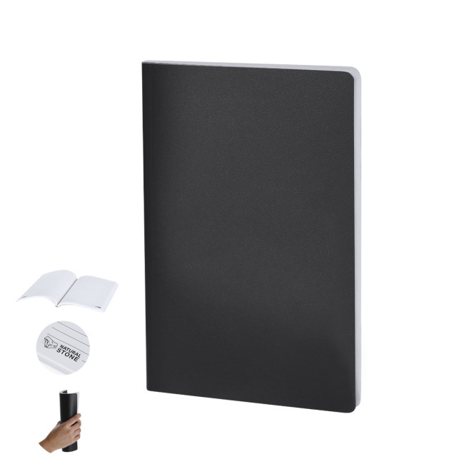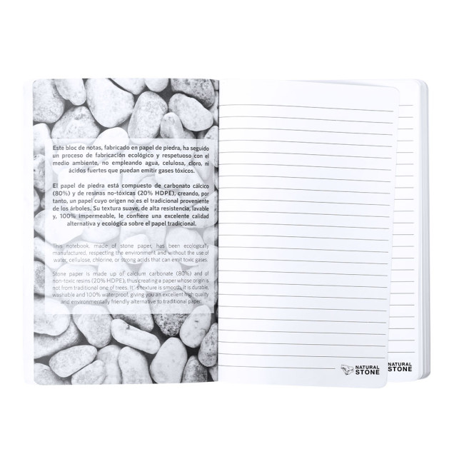 Blocco note con coperture di cartone morbido con fogli fatti di estratti di pietra. Contiene 64 fogli bianchi e una disposizione a righe, con elegante finitura bianca. Logo di pietra naturale su ogni foglio. Include un foglio interno che spiega il processo di produzione da estratti di pietra.