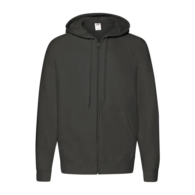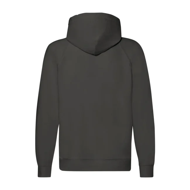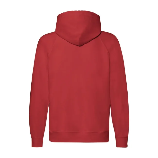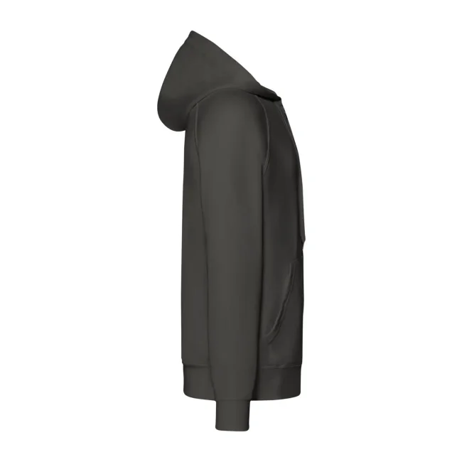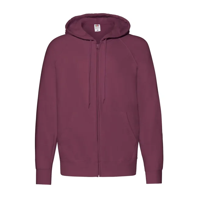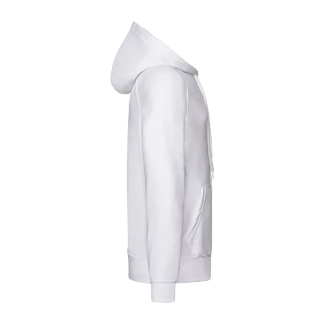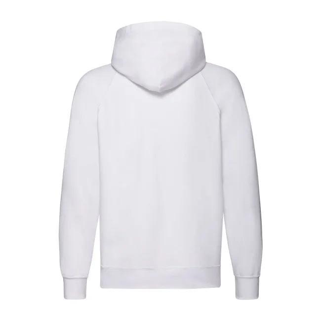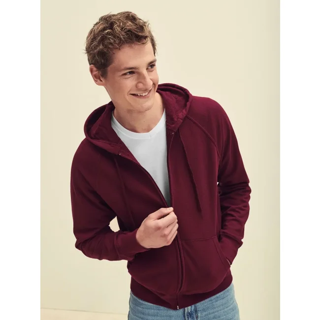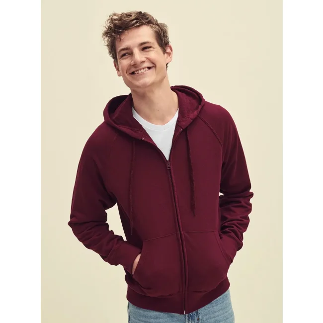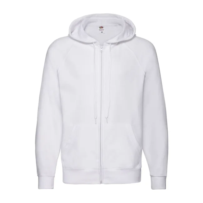 80% cotone Filato Belcoro, 20% poliestere. Felpa leggera sgarzata, maniche raglan, tessuto non pettinato. Fondo e polsini in costina cotone/ Lycra®. Cappuccio con cordino in tinta, due tasche anteriori a marsupio, zip nascosta per facilitare la stampa. La cucitura centrale del cappuccio si ferma a metà per favorire la personalizzazione. Busto tubolare