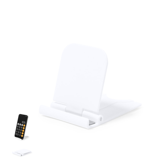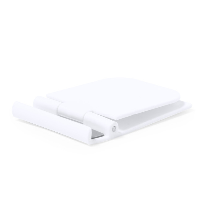 Supporto per smartphone e tablet in ABS resistente. Design compatto e pieghevole per poterlo portare ovunque. Con diverse posizioni di inclinazione e cuscinetti di supporto. Presentato in una borsa individuale riciclata.