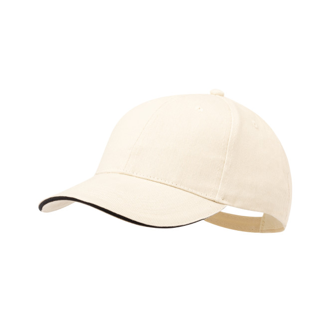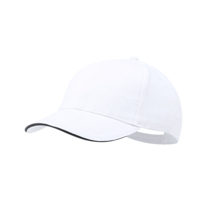Cappellino a 6 pannelli in resistente cotone pettinato da 250 g/m2. Con visiera, occhielli di ventilazione ricamati e chiusura con fibbia in metallo.