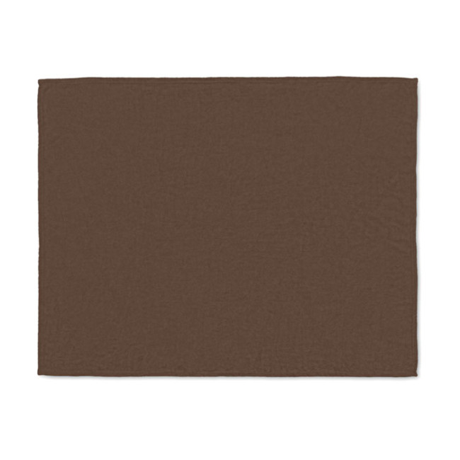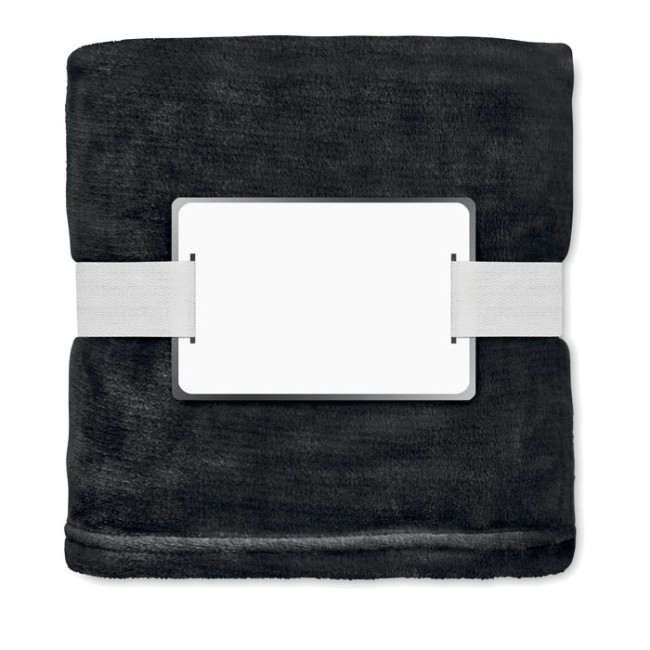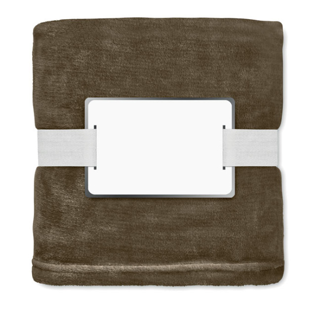 Coperta in pile di flanella RPET da 280 gr/m² avvolta da nastro e cartoncino stampabile.