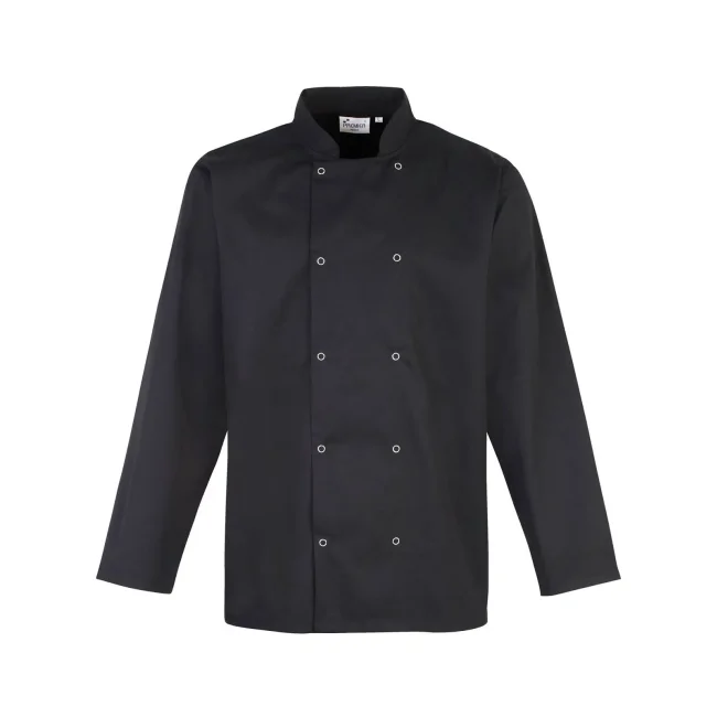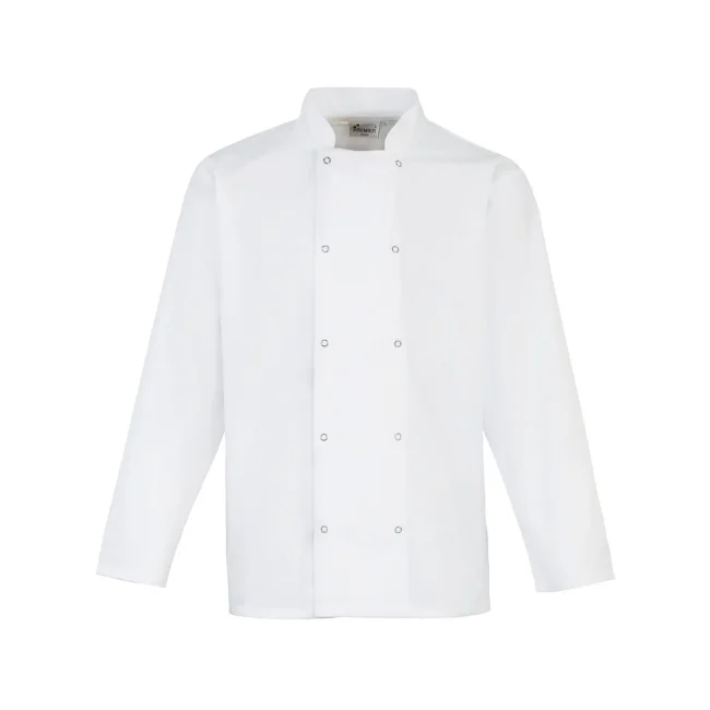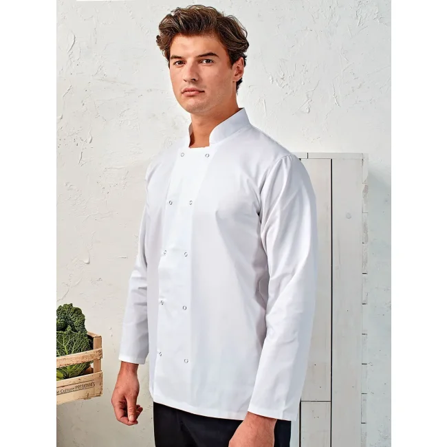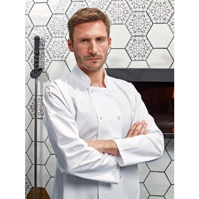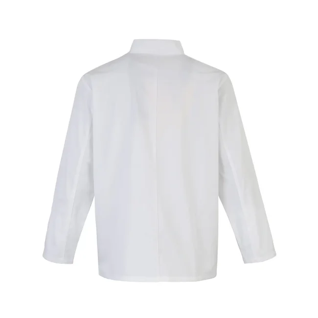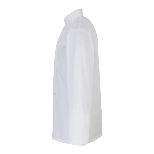 65% poliestere 35% cotone twill. Giacca da Chef dal tessuto morbido, collo alla coreana con impunture, manica lunga, bottoni a pressione, stile unisex. Lavabile a 60°C.