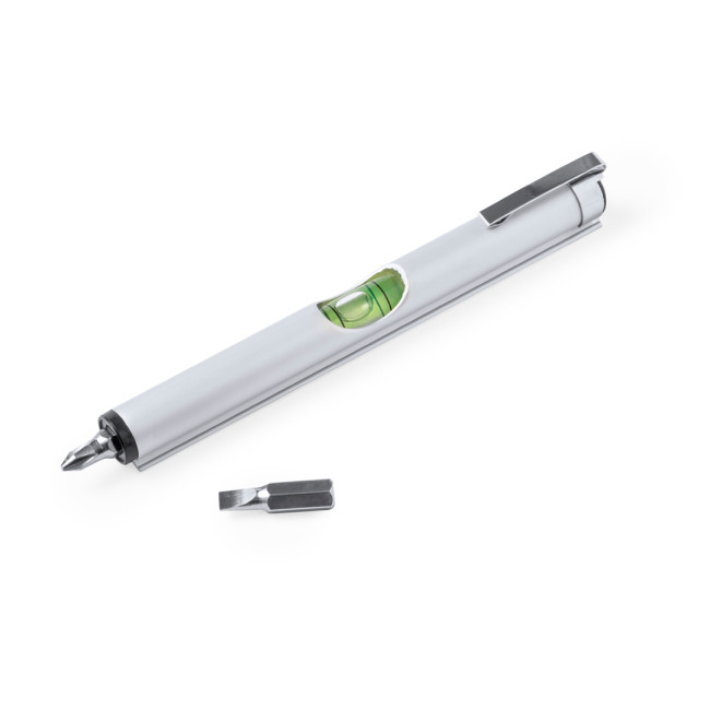 Pratico multiutensile in alluminio, con livella integrata nel corpo e due teste di cacciavite (piatta e philips) all'interno. Con clip in metallo cromato e presentato in una scatola dal design kraft.
