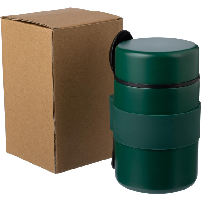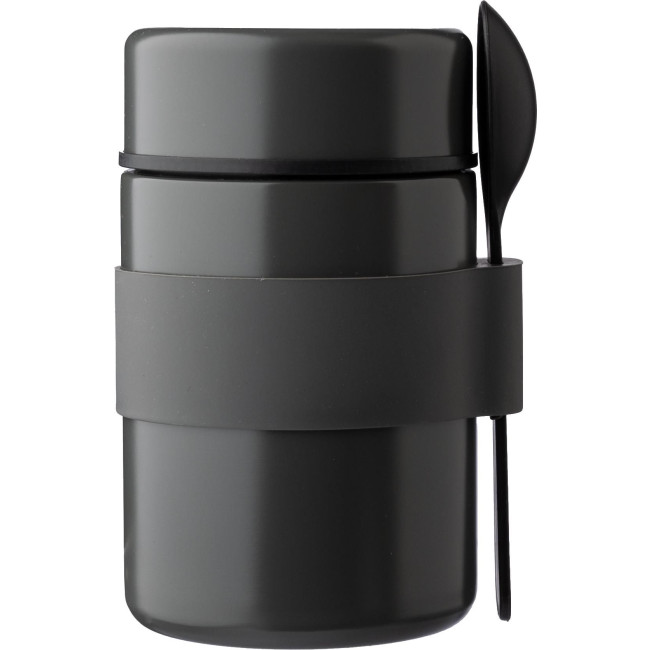 Lunch Box, barattolo termico per alimenti in acciaio inox a doppia parete, interno in acciaio inox 304 ed esterno in acciaio inox 201, coperchio in PP, impugnatura in silicone in tinta, include cucchiaio in PP nero su di un lato, confezionata singolarmente in una scatola in cartone avana, capacità 460 ml