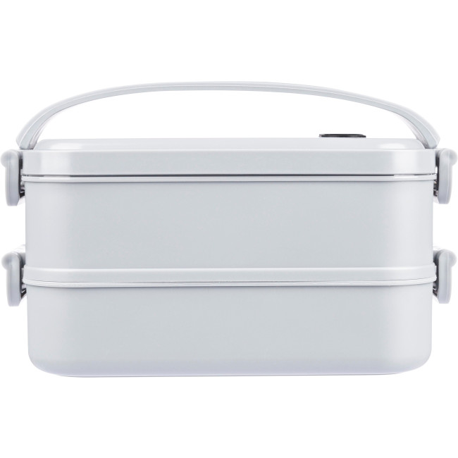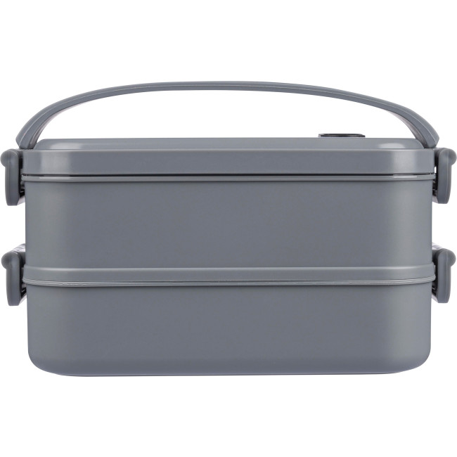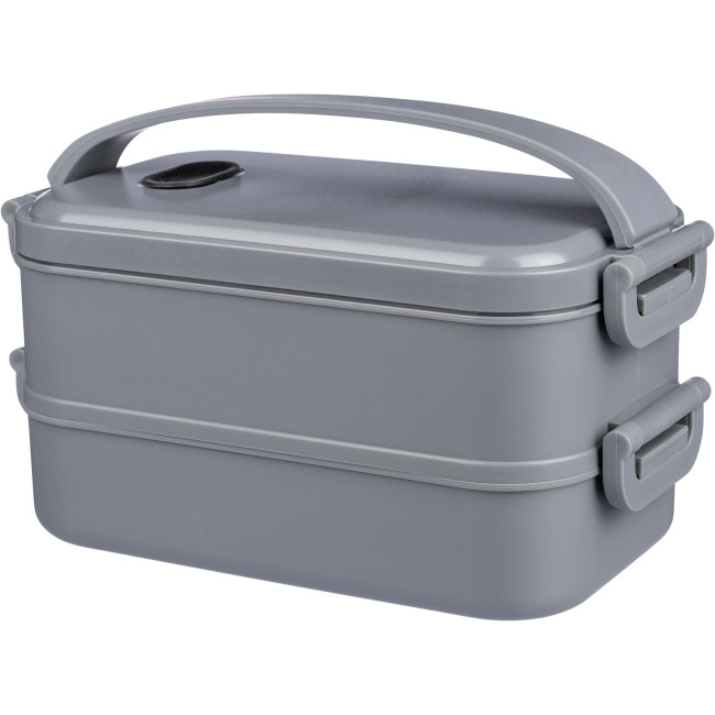 Lunchbox in PP con una capacità totale di 1600 ml, divisa in due strati da 800 ml. Presenta una valvola in silicone adatta all’uso nel microonde, una chiusura a fibbia e una maniglia per il trasporto in silicone. Confezionamento sfuso