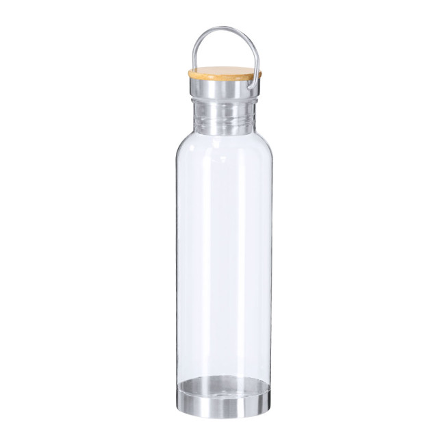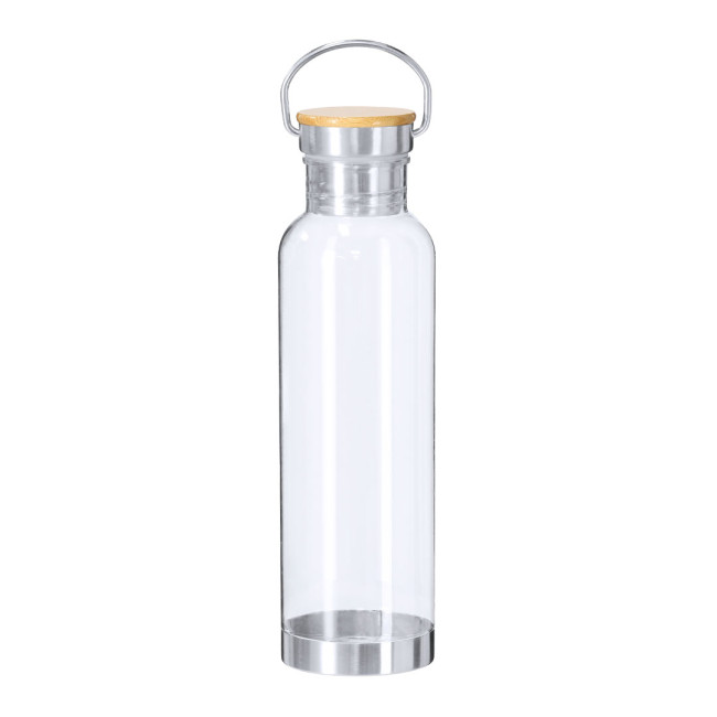 Bouteille RPET de 800 ml avec corps transparent en RPET. Bouchon à vis équipé d’une anse de transport en acier inoxydable, couvercle en bambou et base en acier inoxydable.Le RPET est fabriqué à partir de plastique recyclé, favorisant la réutilisation des déchets plastiques et contribuant à la durabilité de la planète. Des matériaux comme le bambou encouragent l’utilisation de matières premières naturelles, réduisant les émissions polluantes. Le bambou provient d’une plante très résistante et polyvalente, à croissance et régénération rapide, constituant une excellente alternative au bois traditionnel.