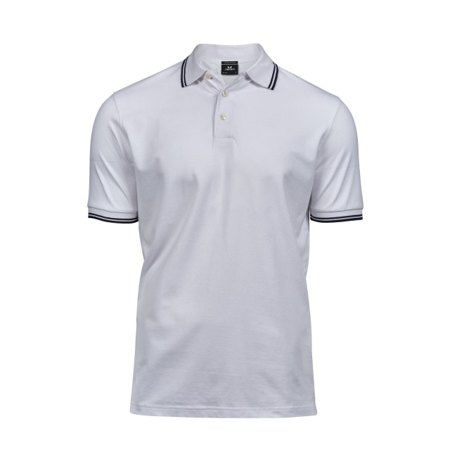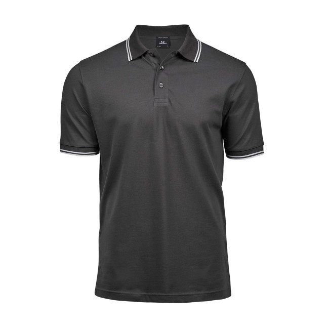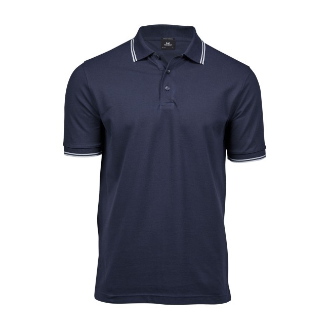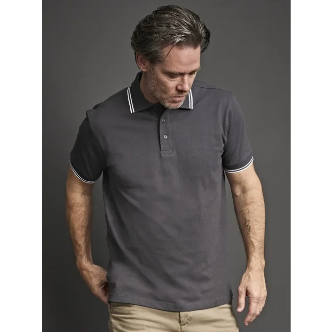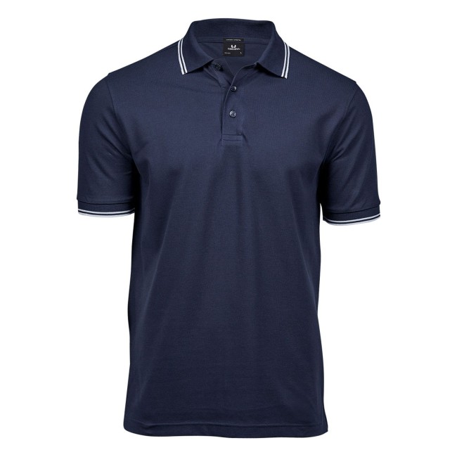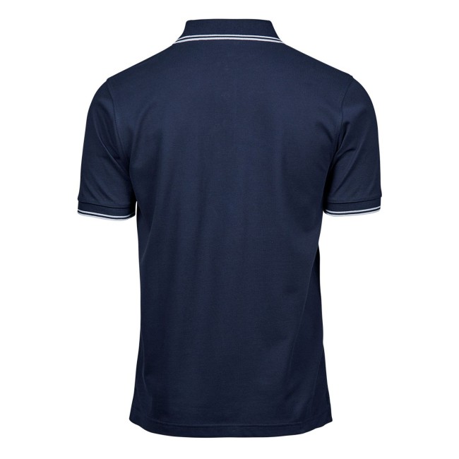 95% cotone ring-spun, 5% elastane. Polo a maniche corte, mini piqué, doppie righe di colore contrastante su colletto e polsini, struttura con cuciture e spacchetti laterali, 3 bottoni tono su tono.