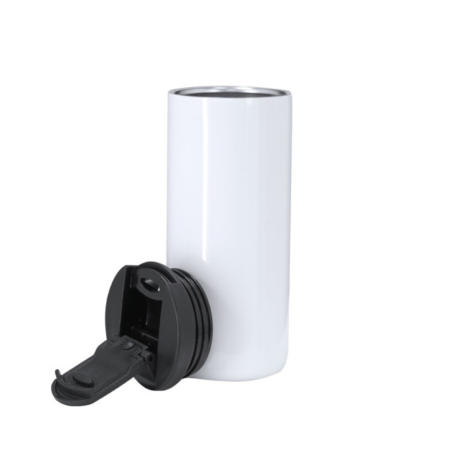 Vaso termico realizzato in acciaio inox a doppia parete e capacità di 370 ml. Progettato specificamente per la marcatura in sublimazione, finitura bianca lucida. Dotato di un dosatore sul coperchio di colore nero, progettato per evitare perdite e privo di BPA.