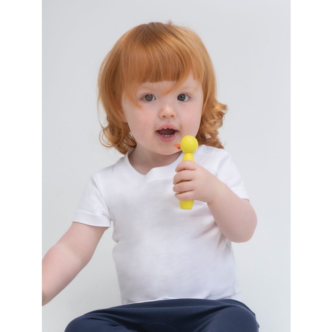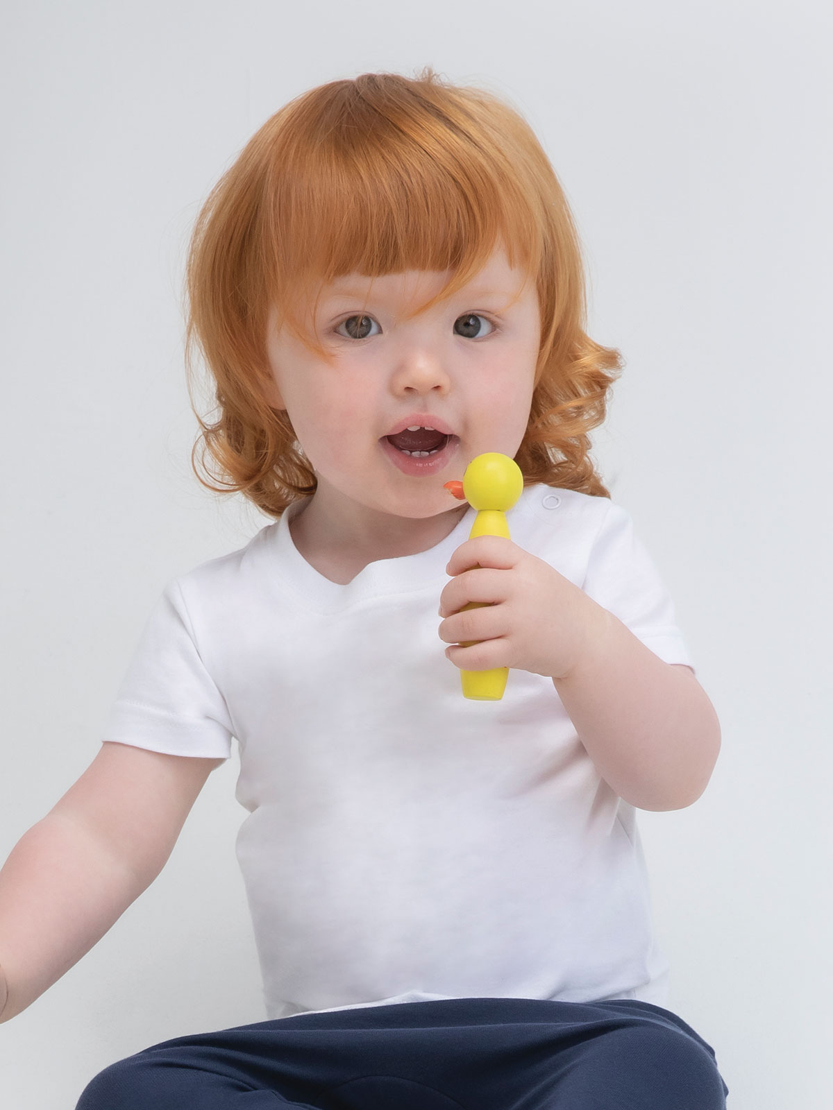 100% cotone (organico o in conversione), single jersey 150 g/m2. T-shirt da neonato con bottoni automatici senza nichel. Cuciture piatte sulle maniche e sull'orlo. Etichetta taglia removibile sul collo. Etichetta con istruzioni di lavaggio in cotone organico.