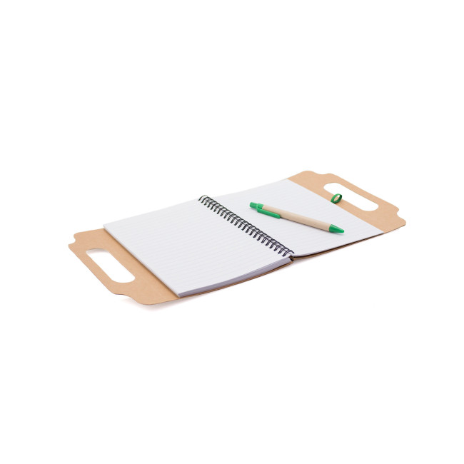 Block notes con note adesive e penna in cartone riciclato incluse. Design originale, con maniglie di trasporto fustellate e copertine morbide al tatto rifinite in resistente cartone riciclato rigido. Con portapenna integrato, include un blocco da 70 fogli a righe, 25 note adesive medie e 125 note adesive mini."