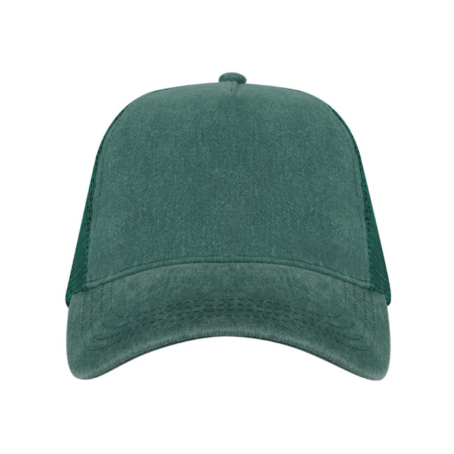 Cappellino a 5 pannelli con effetto lavato, realizzato principalmente in morbido cotone, retro in mesh dello stesso colore. Ideale per tutti i giorni grazie alla sua pratica traspirabilità. Chiusura posteriore regolabile in plastica.