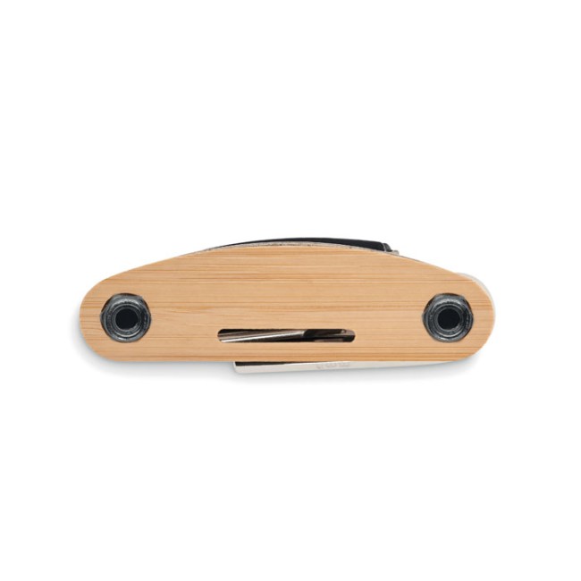 Utensile tascabile multifunzione in acciaio inossidabile con copertura in bamboo. 11 funzioni. Include: chiavi esagonali, chiave piatta, prolunga, cacciavite Phillips e chiave a bussola.
