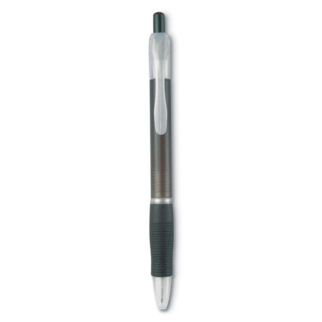 Penna a sfera in ABS con impugnatura in gomma. Meccanismo a scatto. Refill nero.