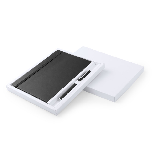 Set composto da taccuino con copertina in similpelle soft touch e biro abbinata con corpo coordinato. Con 100 pagine lisce, chiusura con fascia elastica e segnalibro in tessuto coordinato. Presentato in un'elegante scatola di cartone bianca fustellata. Biro in inchiostro blu.