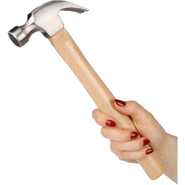 Martello ad artiglio in legno di faggio con testa in acciaio resistente, confezionato in modo sicuro con una custodia in carta kraft e una fascetta di carta intorno alla testa per una maggiore protezione.