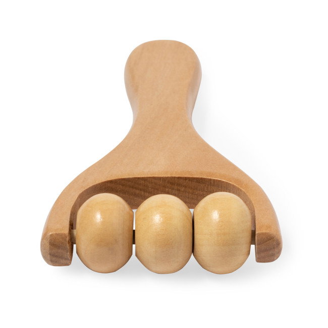 Massaggiatore in legno naturale progettato per sciogliere le tensioni muscolari. L'impugnatura ergonomica garantisce un utilizzo confortevole, mentre i tre rulli offrono un massaggio rivitalizzante. Confezionato in una scatola kraft, è un prodotto ecologico e pratico.