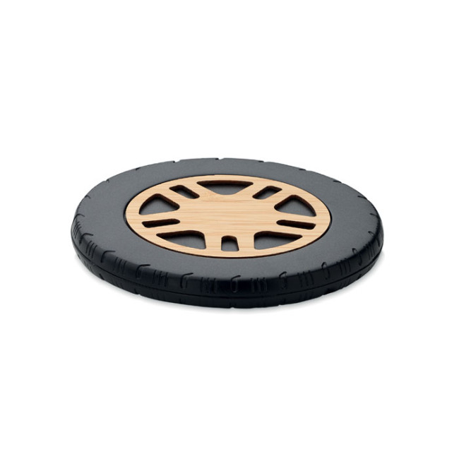 Caricatore wireless 15W in ABS riciclato con top in bamboo a forma di pneumatico. Uscita: DC 9V/1.10A (15W) per una ricarica rapida. Compatibile con gli ultimi Android, iPhone® 12, X e successivi.