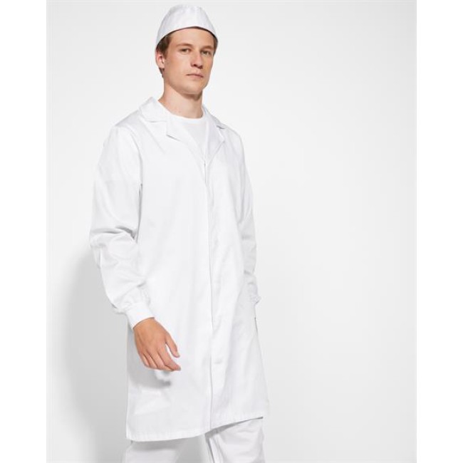 Camice a maniche lunghe unisex. · Polsini regolabili 1x1 a costine. · Apertura centrale con pulsanti automatici all'interno. · Tasca interna sul lato sinistro.