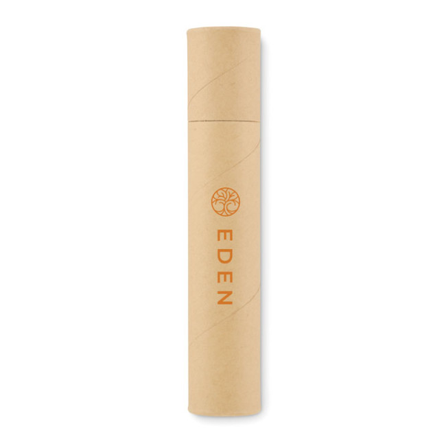 Scatola in tubo di carta con 2 matite, 1 penna in cartone, 1 temperino in legno e 1 gomma.