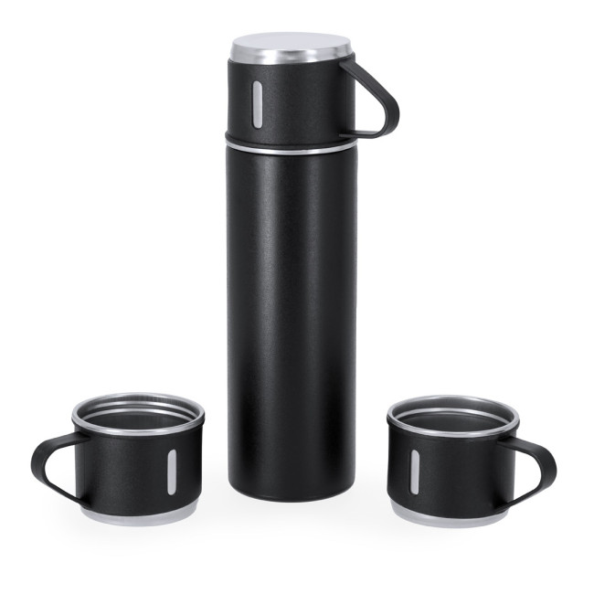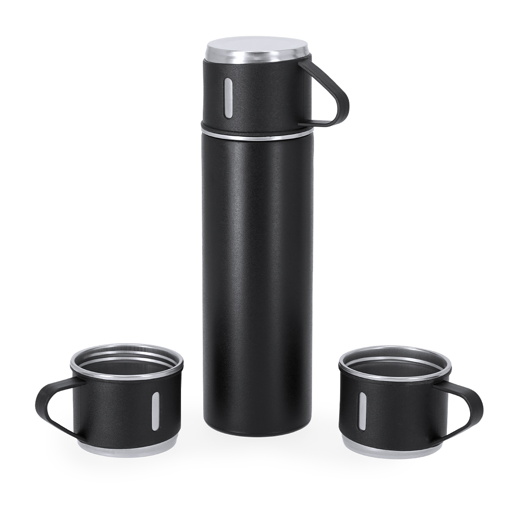 Set di bottiglia termica e 3 tazze in acciaio inossidabile. Termos a doppia parete con capacità di 420 ml, garantendo una migliore e più duratura conservazione della temperatura, con distributore di sicurezza. Tazze da 140 ml con regolazione a vite in un elegante design nero, ottimo per gustare una bevanda calda o fredda, in qualsiasi momento e ovunque. Presentato in un elegante astuccio nero.