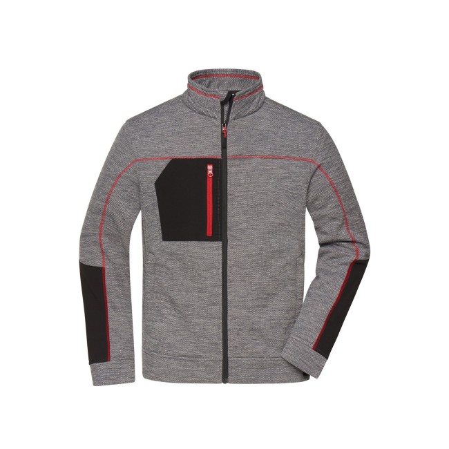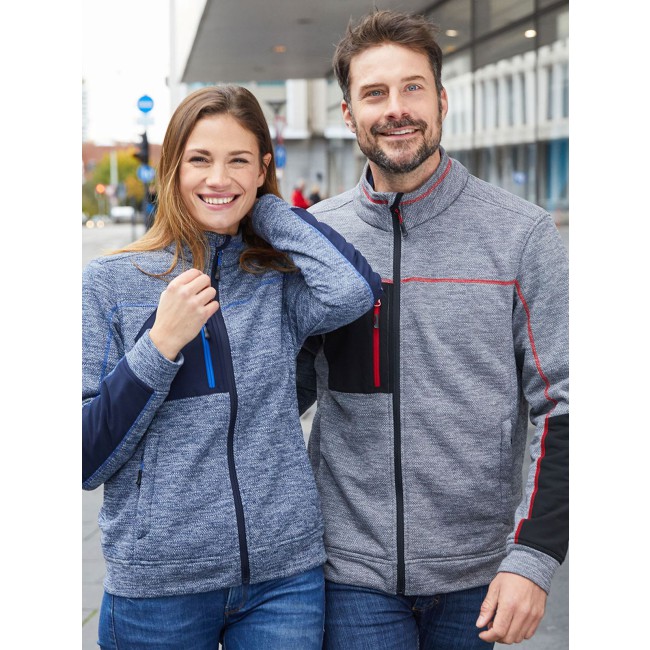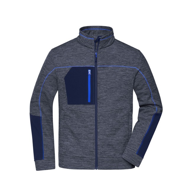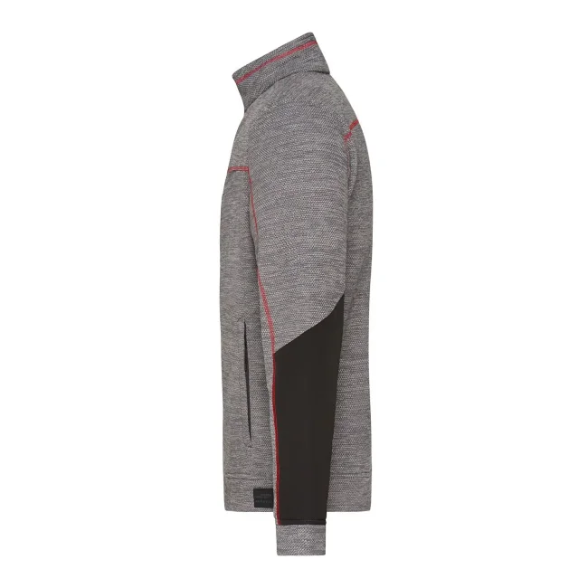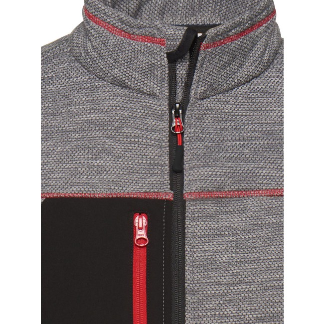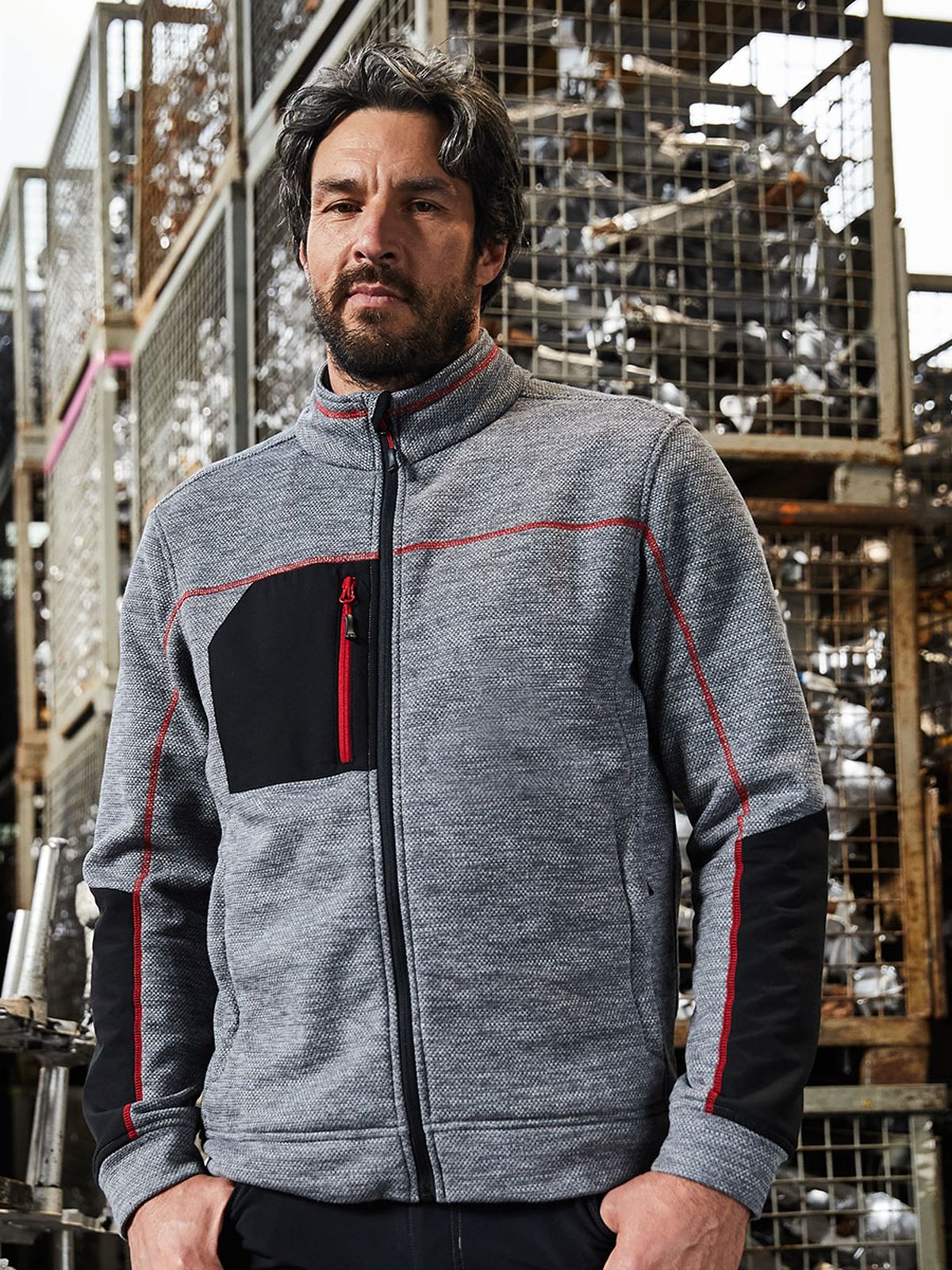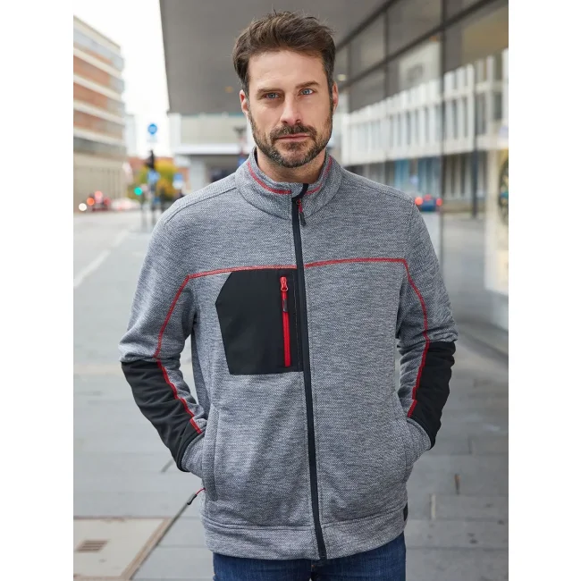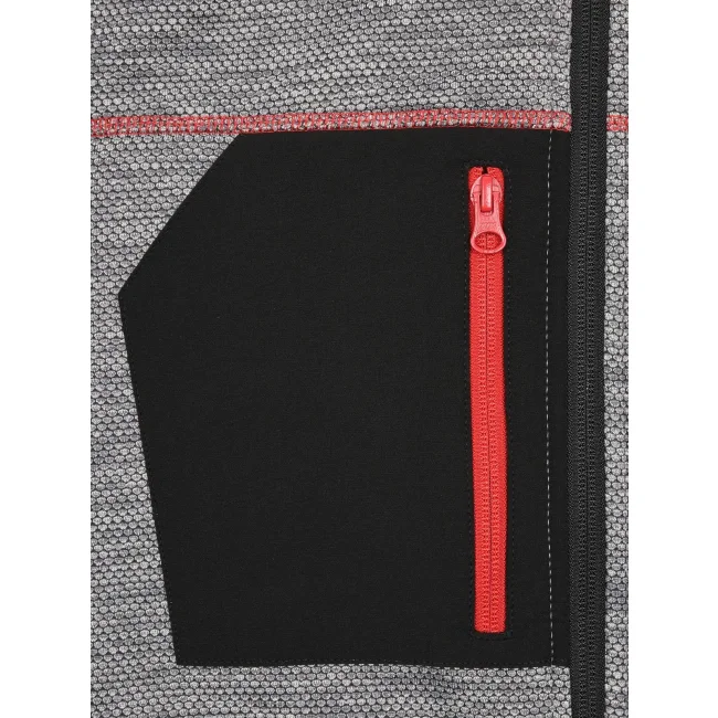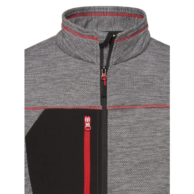 80% poliestere riciclato, 20% poliestere. Giacca in pile mélange easy-care, morbida e calda, felpata internamente, 2 tasche laterali con zip, 2 tasche interne, taschino sul petto con zip e cuciture a contrasto, colletto alto, zip frontale con protezione per il mento, zip: YKK.