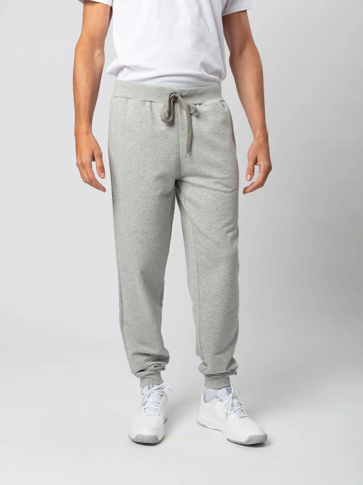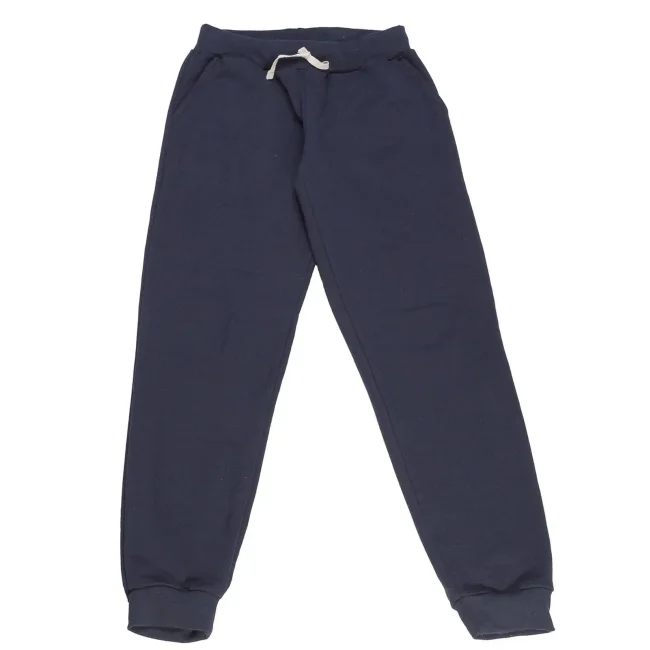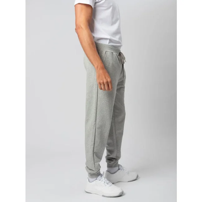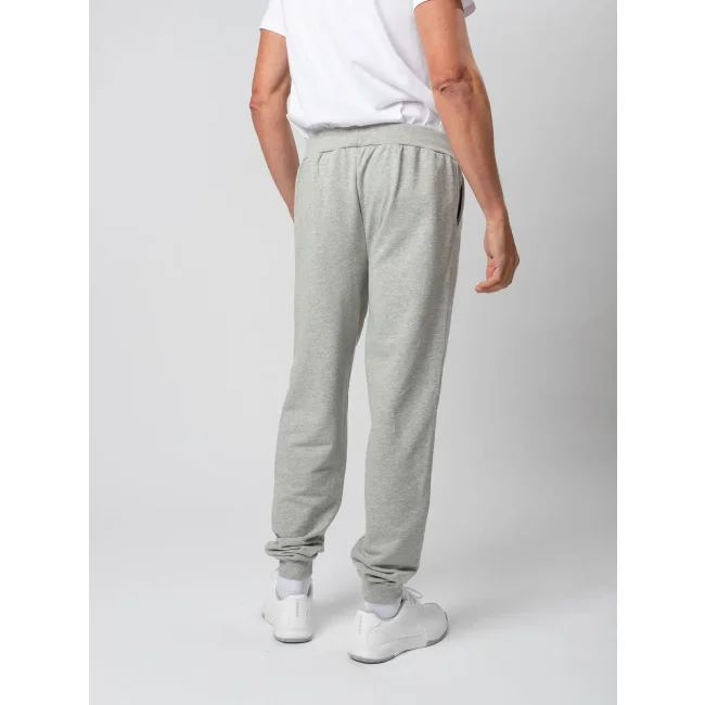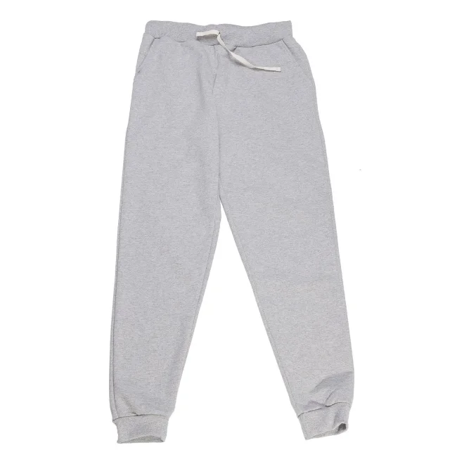 80% cotone, 20% poliestere. Pantaloni in felpa con polsini alle caviglie, non felpati, due tasche laterali, elastico in vita con cordoncino tono su tono.