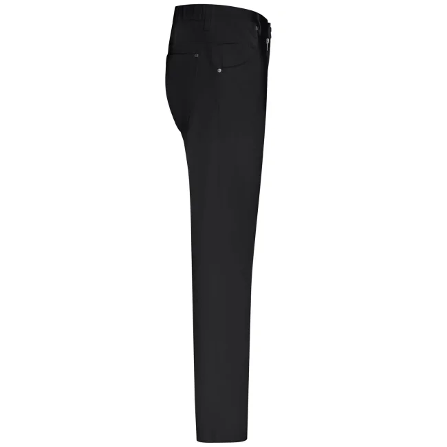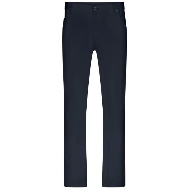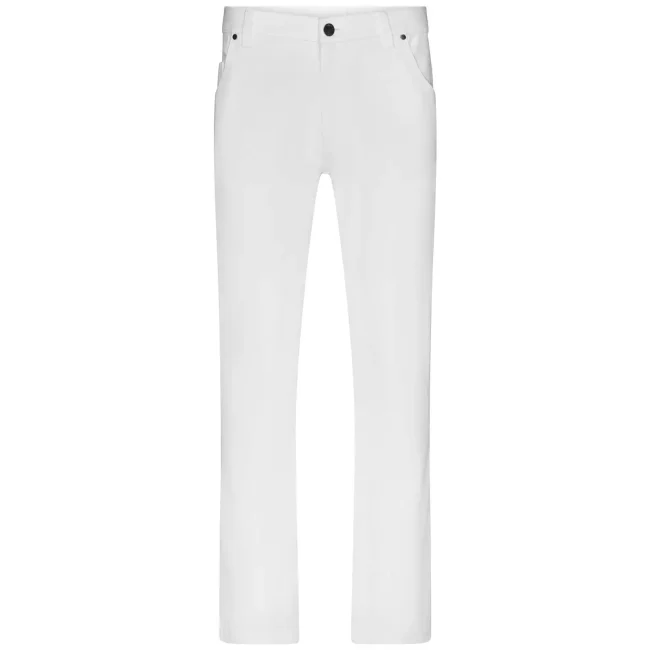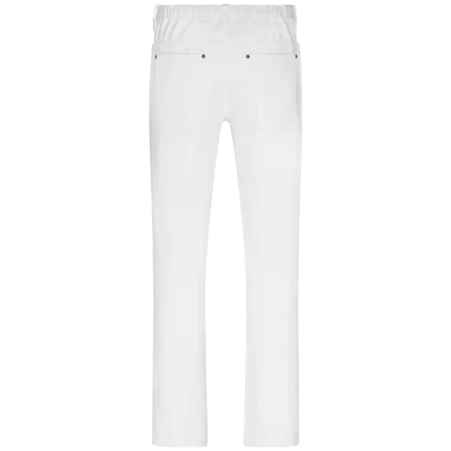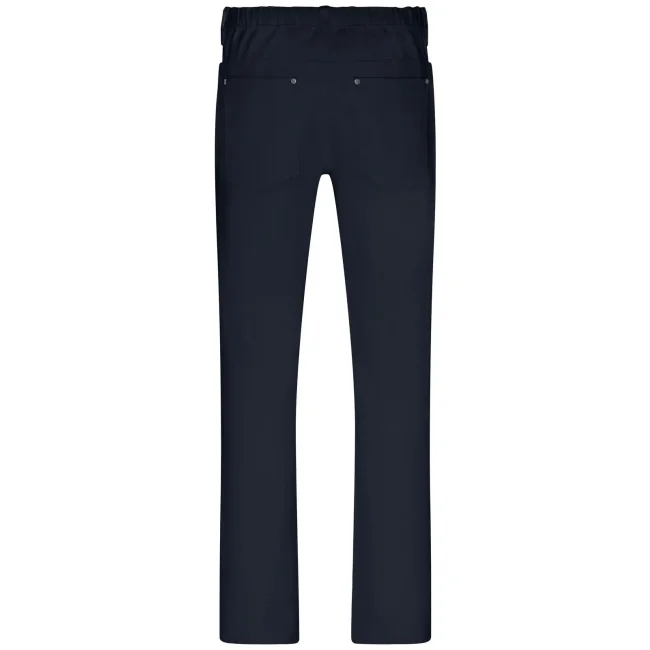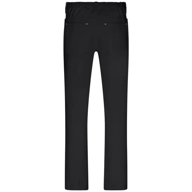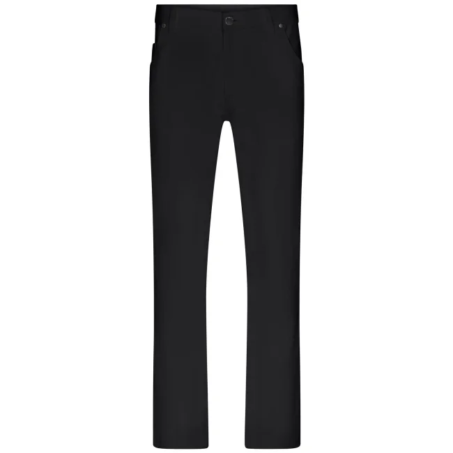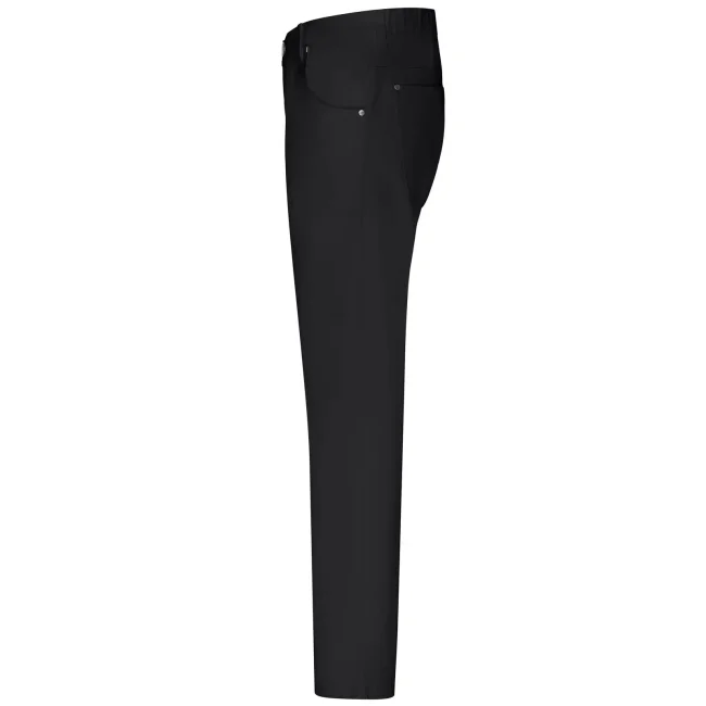 65% poliestere 32% cotone 3% elastan, 260 g/m2. Pantaloni elasticizzati a 5 tasche, vita regolare, zip YKK. Lavabili a 60°C.
