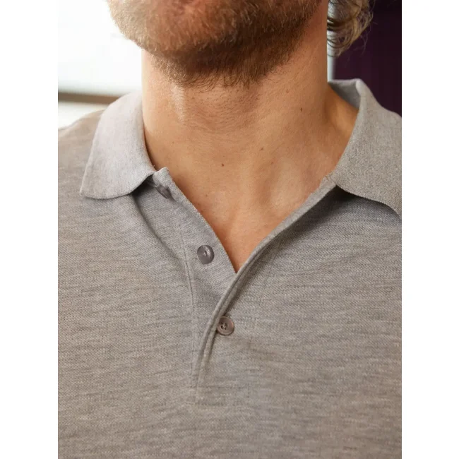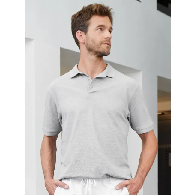 50% cotone organico pettinato ring-spun, 50% poliestere. Polo da uomo con colletto e polsini in tessuto a maglia, neck tape, abbottonatura con 4 bottoni, spacchi laterali, lavabile fino a 60 gradi.