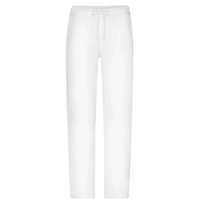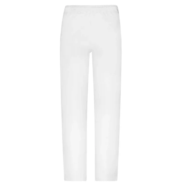 65% poliestere 35% cotone, 200 g/m2. Pantaloni con vita elasticizzata regolabile con cordino, taglio dritto, 2 tasche laterali. Lavabili a 95°C.
