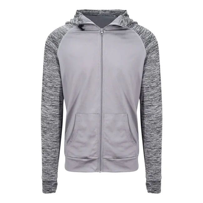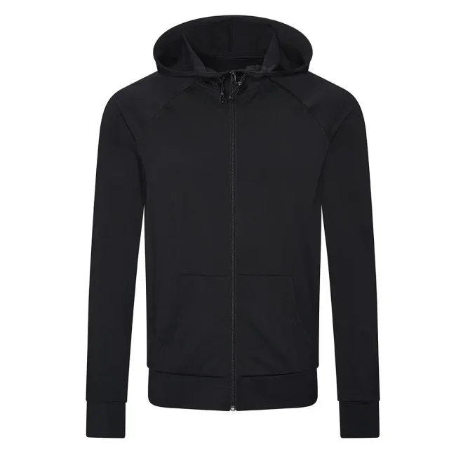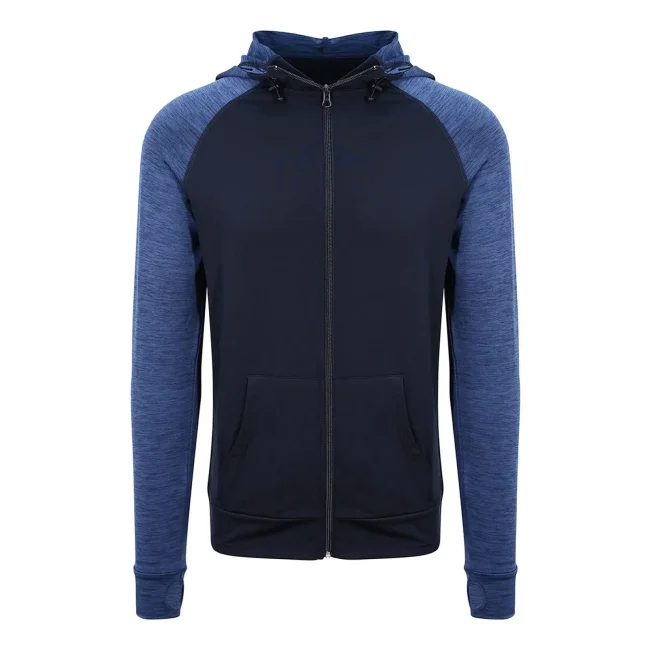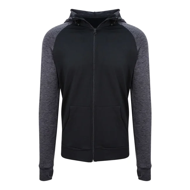 Parti a contrasto: 92% poliestere 8% elastan. Corpo: 89% poliestere 11% elastan. Felpa con cappuccio e maniche raglan da uomo, tessuto misto poliestere, tessuto traspirante ad asciugatura rapida, cappuccio regolabile, tasca a marsupio, zip intera, fori per i pollici.