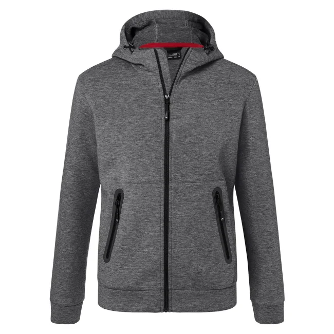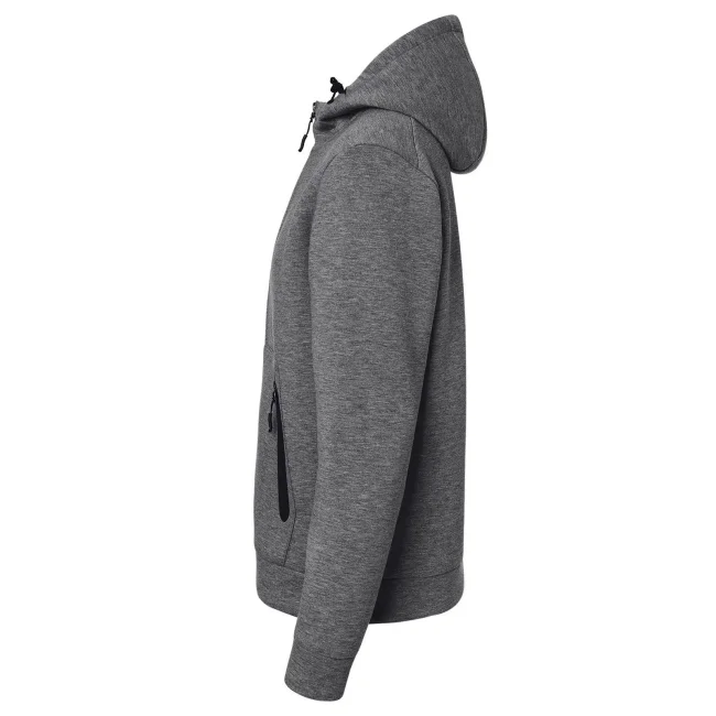 92% poliestere, 8% elastan. Giacca con cappuccio regolabile con cordoncino, tasca a marsupio con cerniera.