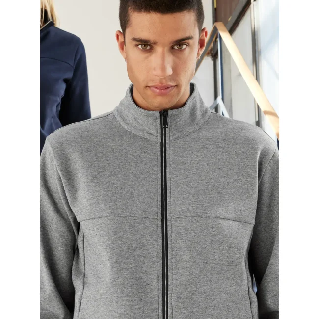 47% cotone, 46% poliestere, 7% elastan. Felpa da uomo in tessuto interlock indeformabile, in policotone elasticizzato, zip lunga, collo alto, 2 tasche laterali nascoste con zip, 2 tasche interne, fascia e polsino con orlo
