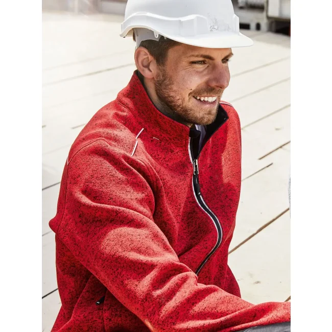 100% poliestere. Giacca da lavoro in pile, tessuto easy-care morbido e caldo in stile melange, lavorato a maglia sull'esterno, interno felpato, soffice e morbido, due tasche laterali con zip nascosta, due tasche interne, collo alto, dettagli riflettenti (senza funzione protettiva / senza DPI) su zip, spalle e sul retro, zip interna nascosta con protezione per il mento, zip YKK.